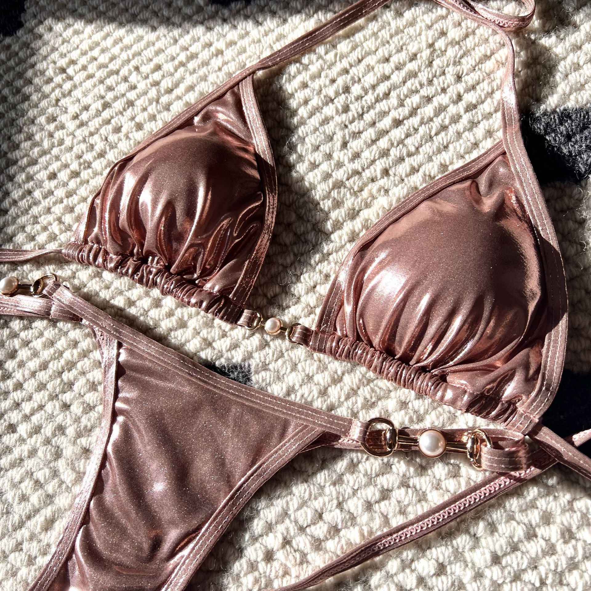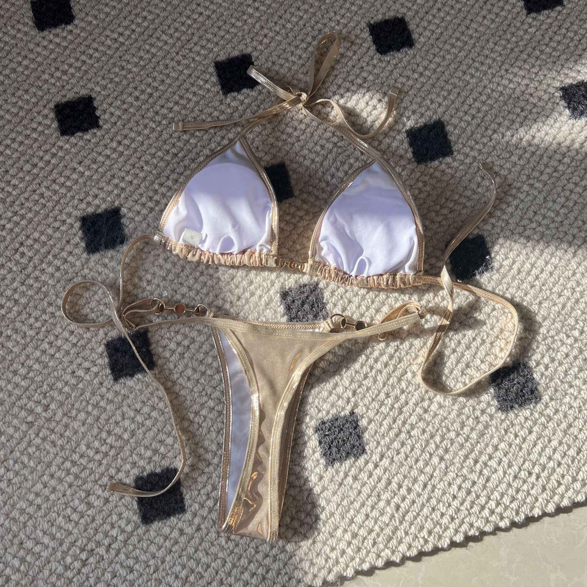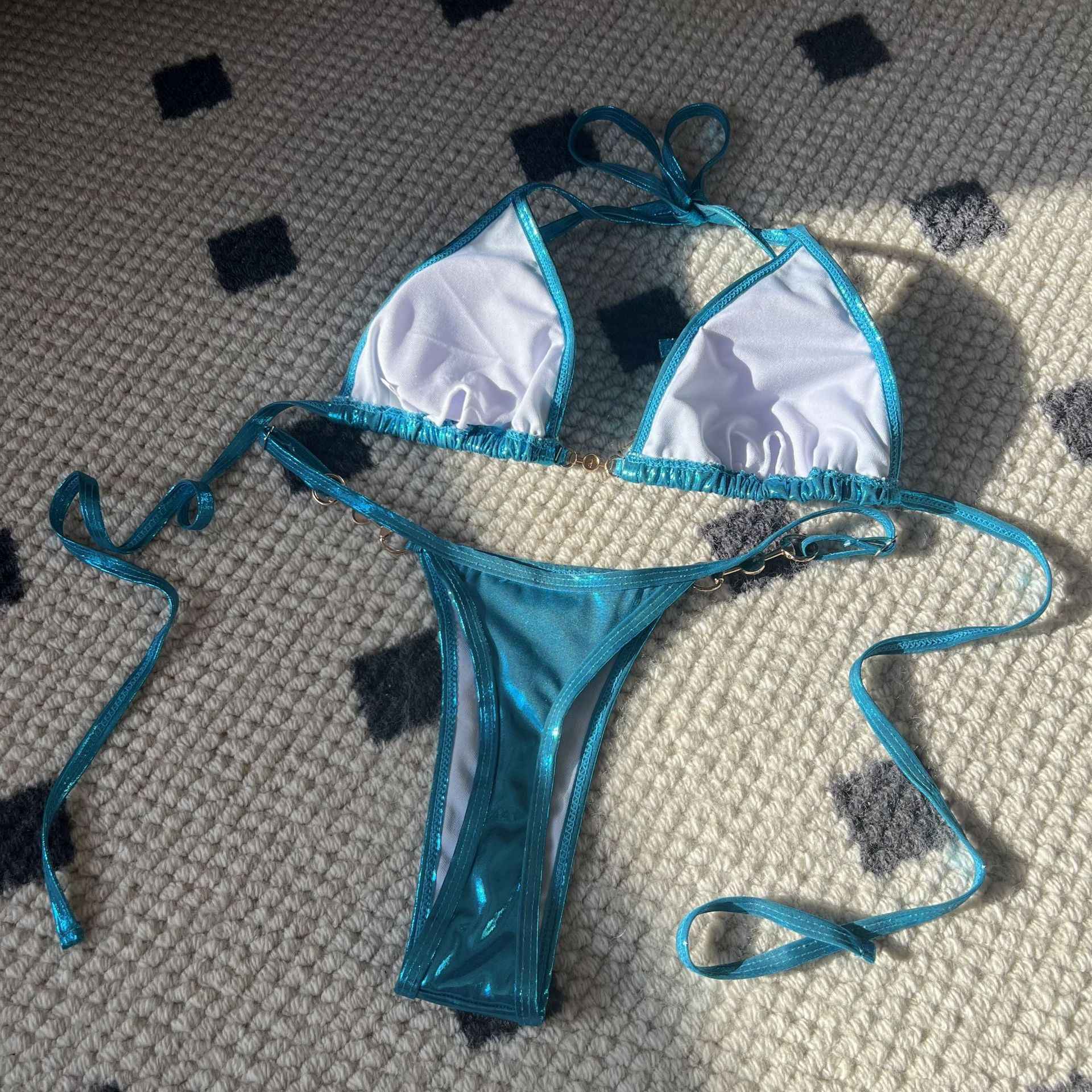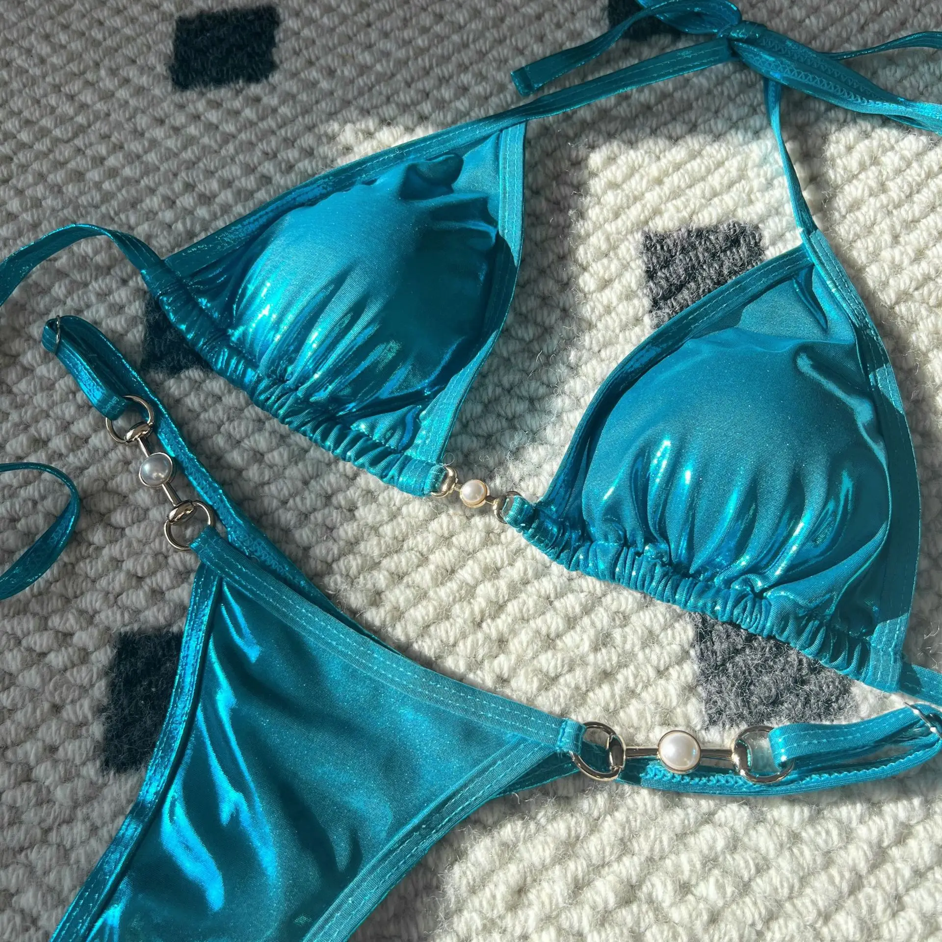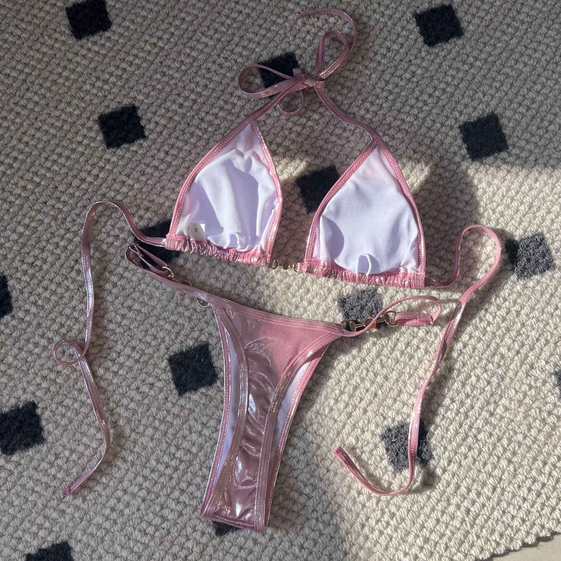 Shiny pink micro bikini 2024 mujer women sexy PU pearls push up thong swimsuit summer bathing suit bandage holiday swimwear