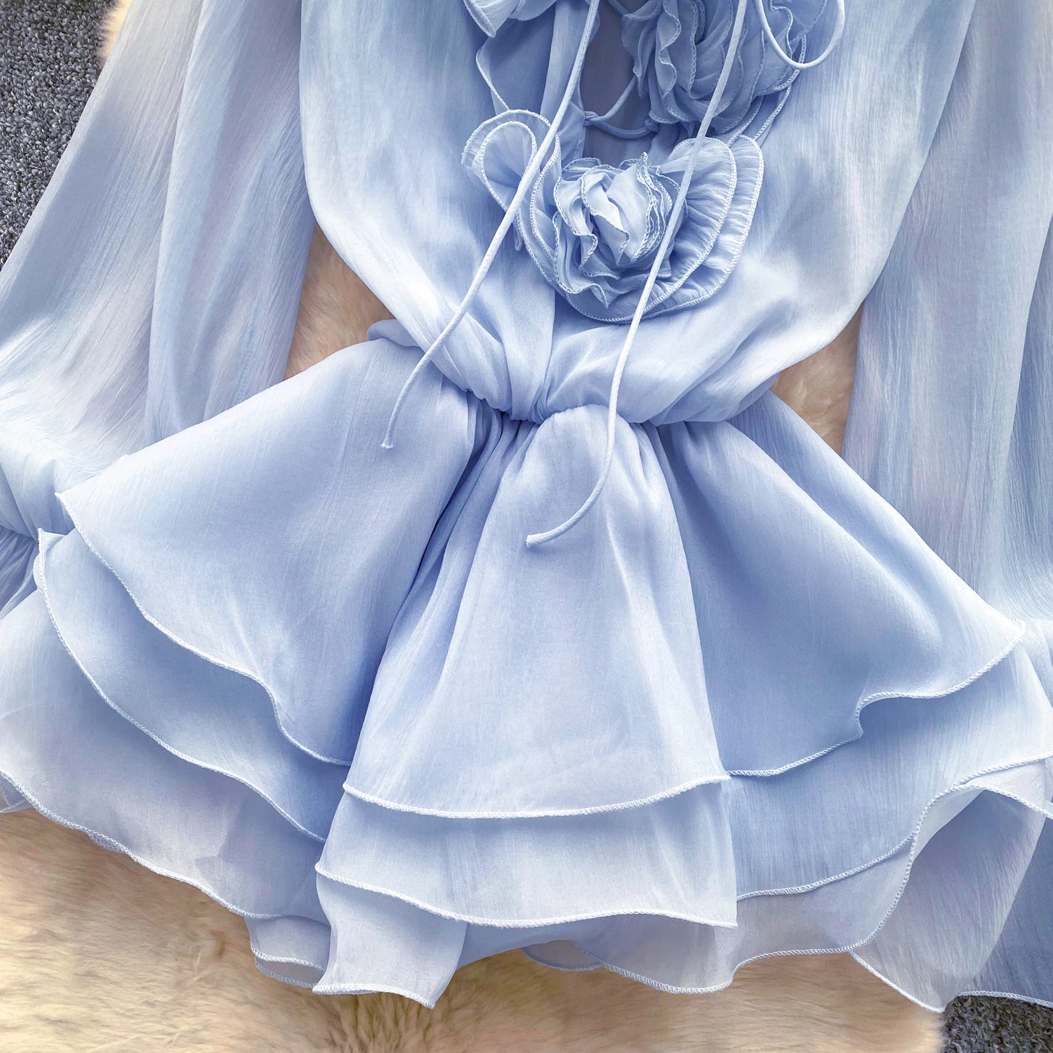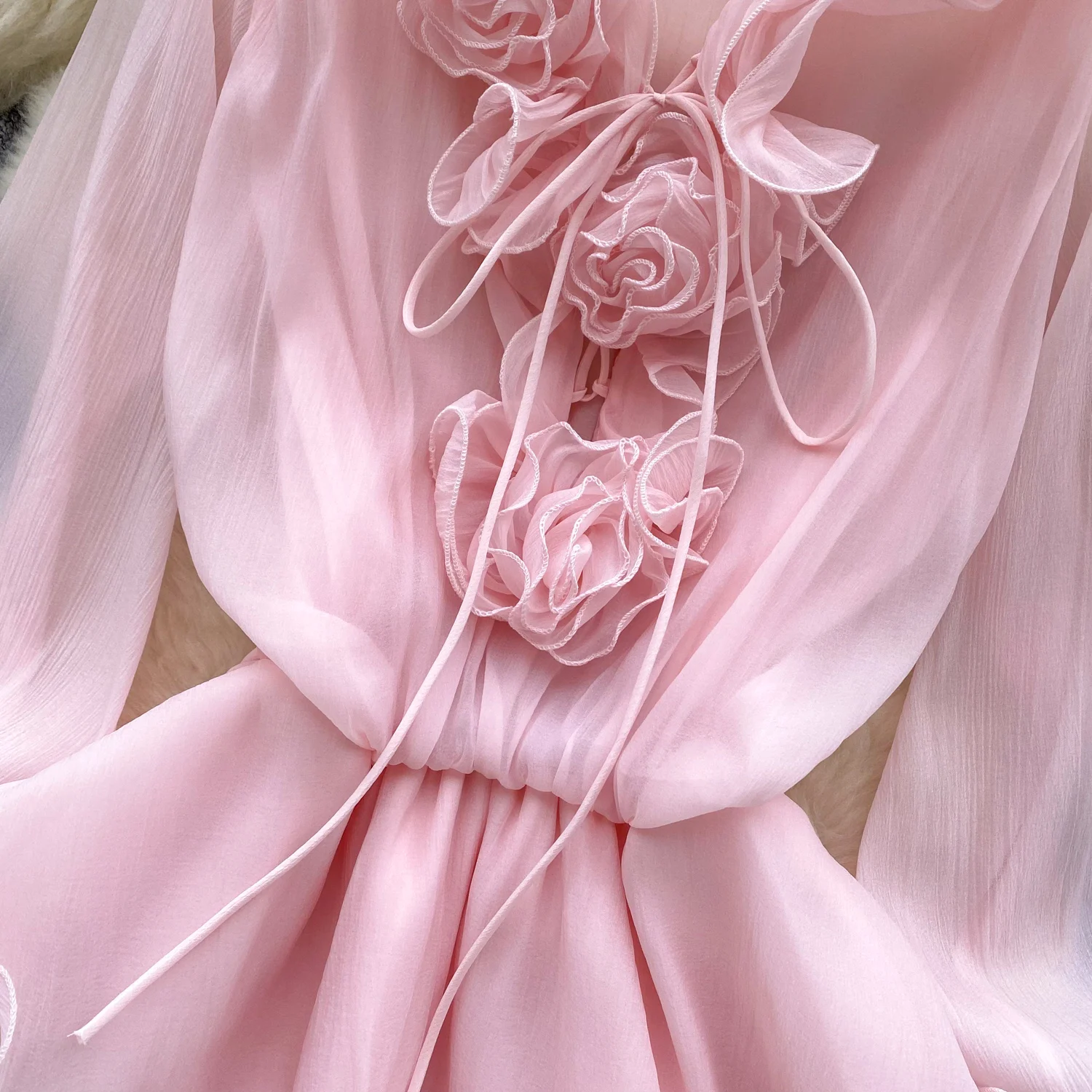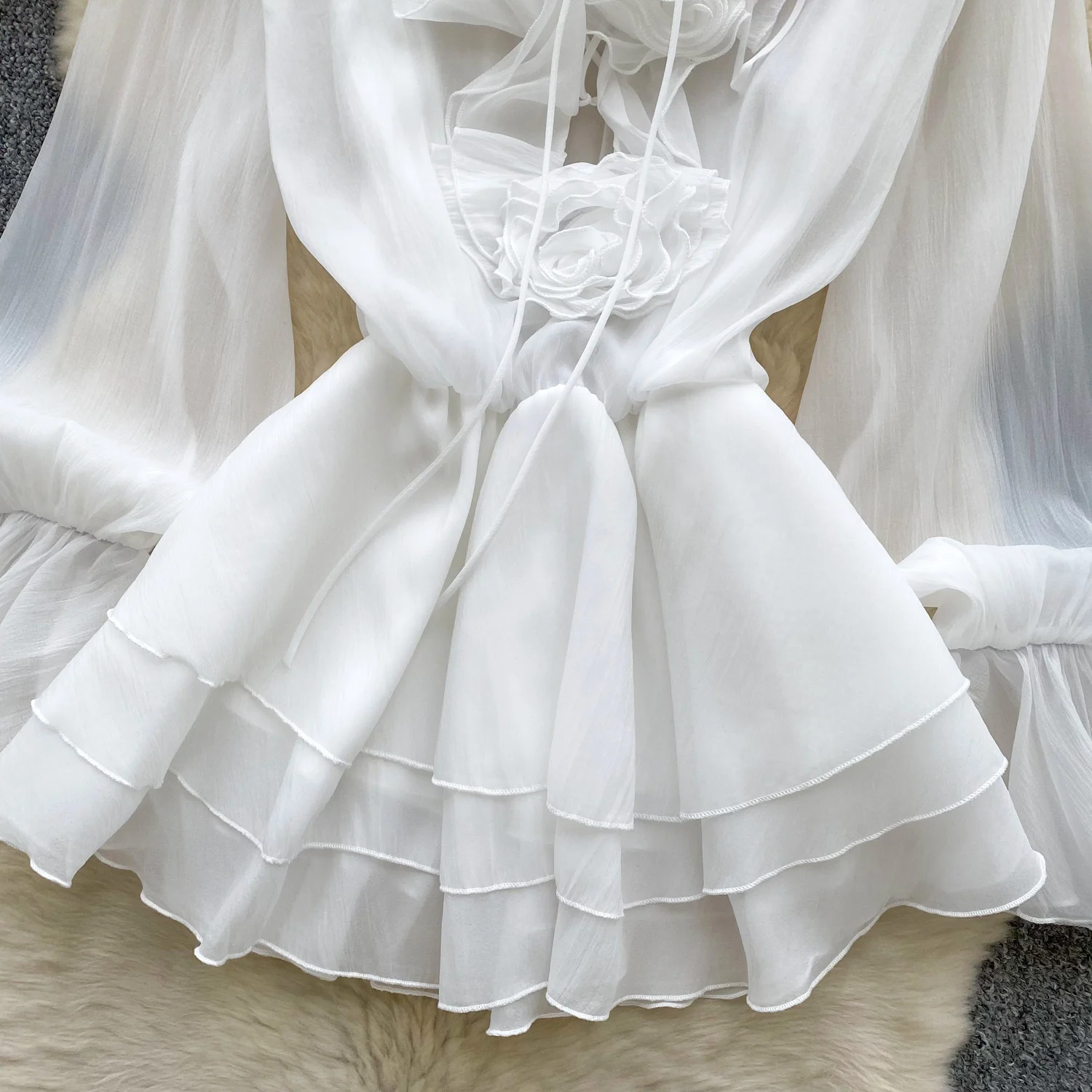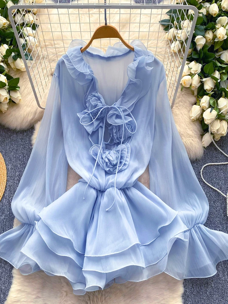 SINGREINY 3D Floral Beach Short Dress Female Long Sleeves Lace Up Ruffle Chiffon
