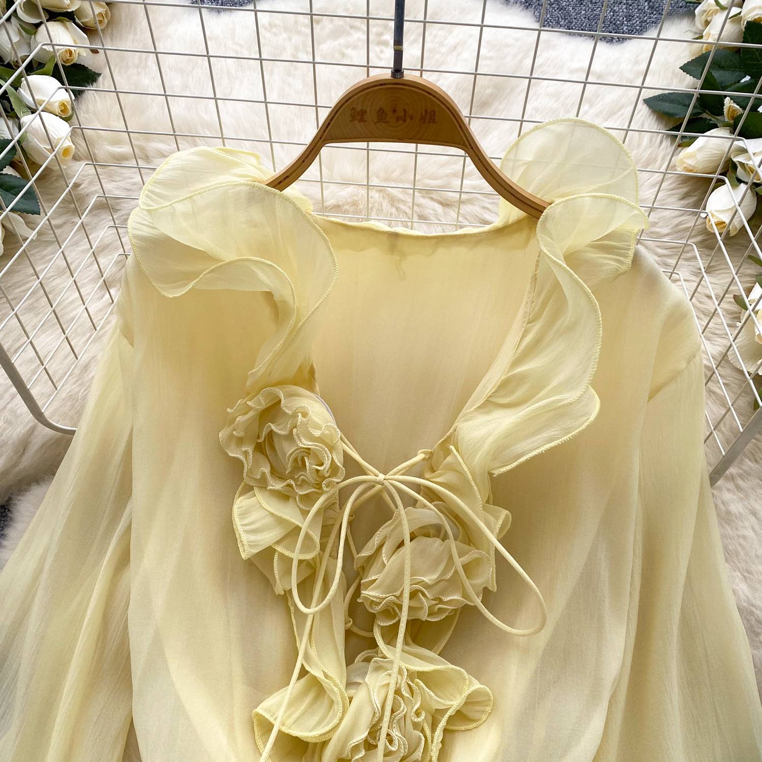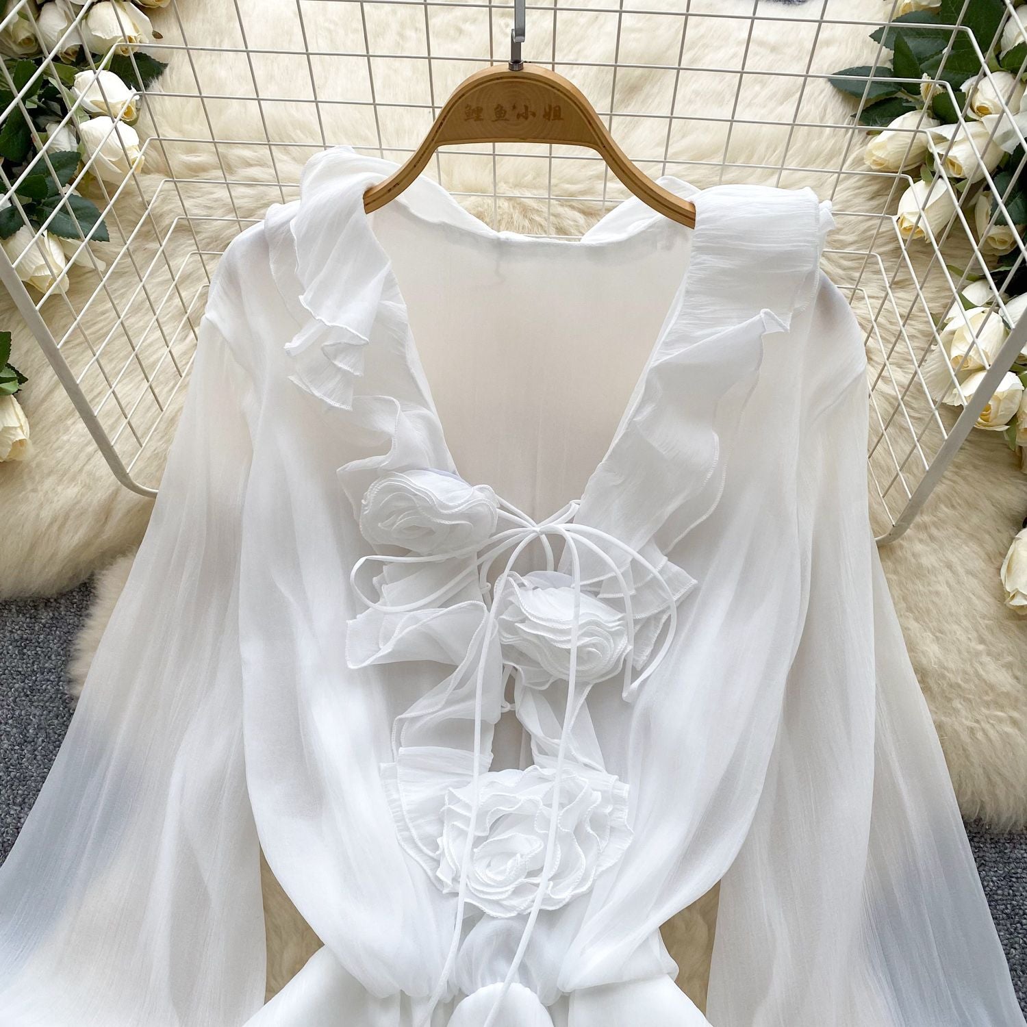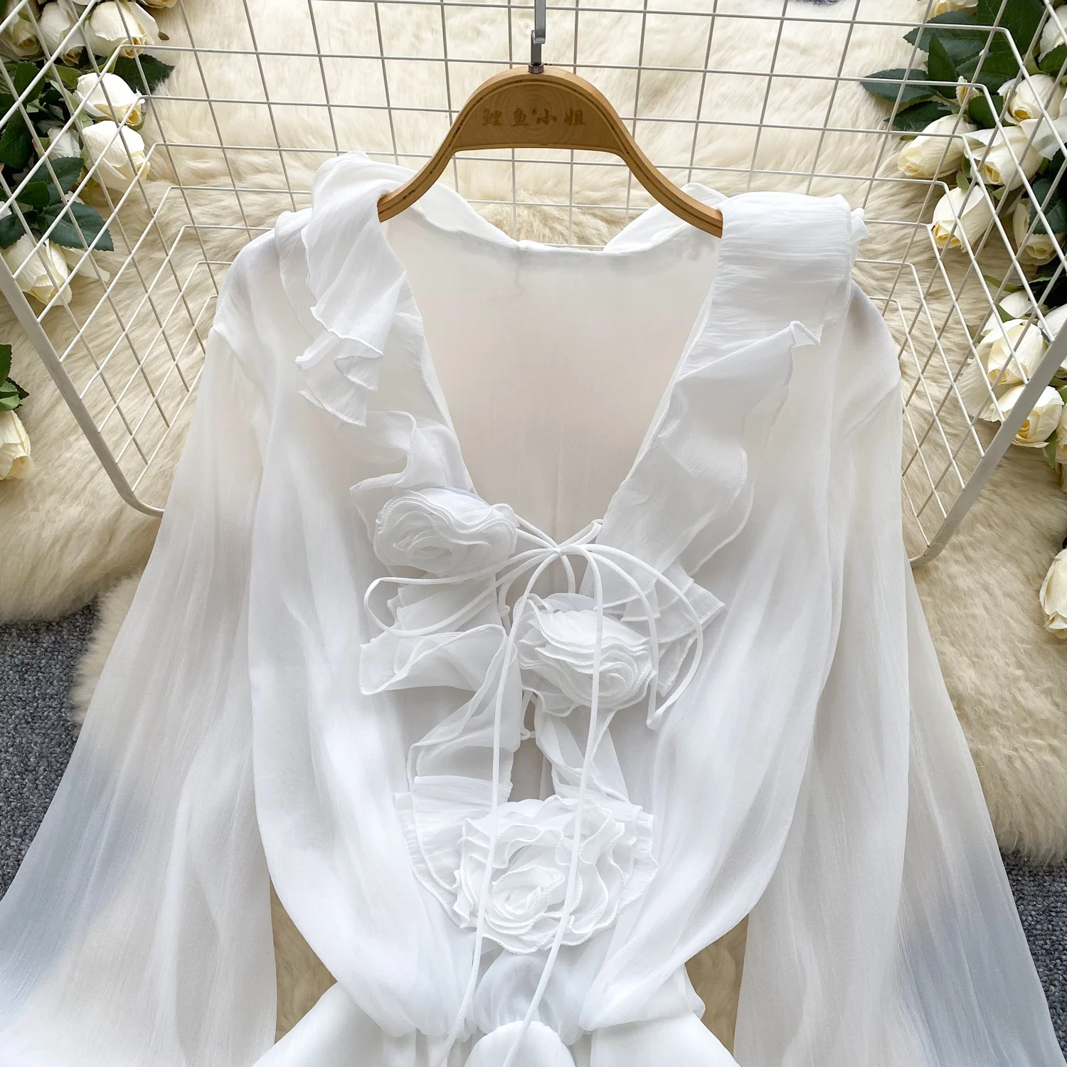 SINGREINY 3D Floral Beach Short Dress Female Long Sleeves Lace Up Ruffle Chiffon