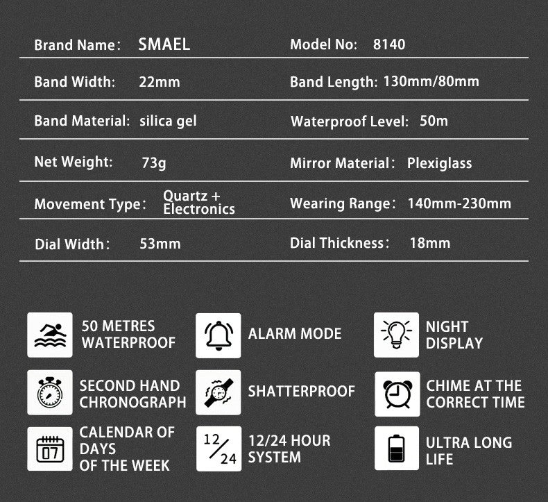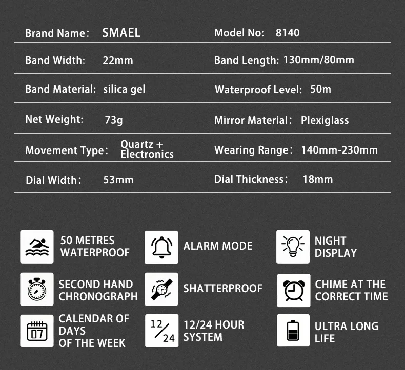 SMAEL Brand 8140 Waterproof Dropshipping Watch Alarm Clock night light Young Fashion business Quartz Sport Wristwatches