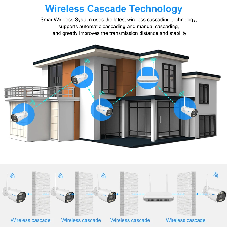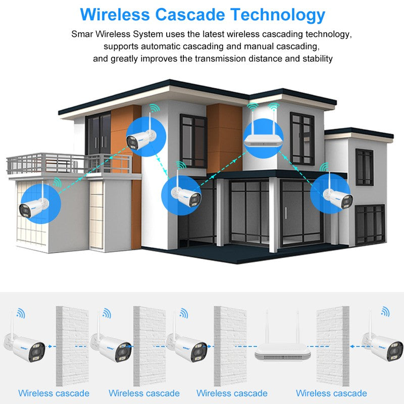 Usually, the camera is a transmitter; The purpose of the cascade technology is that it can turn each WiFi camera into a transmitter and a receiver. It can receive WiFi NVR signals and then transmit the signals to nearby WiFi cameras, the cascading module is built into the body of each WiFi camera.