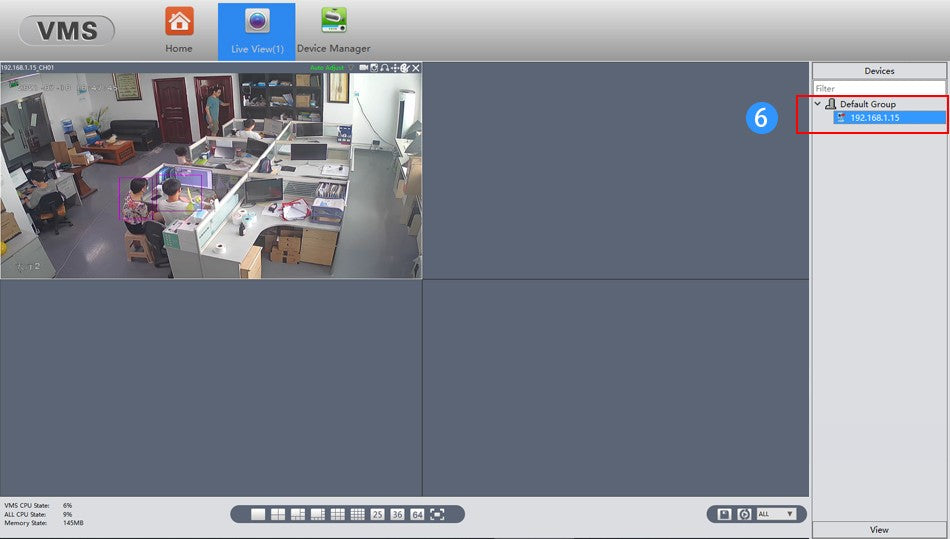 4. Click t he Live View, then click IP Address of Default Group, then you will can Watching Video.