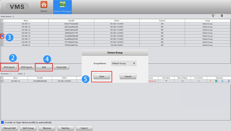 3. Please click the Device Manager-IPV4 Search-choose address of IP Camera- ADD-SAVE,Search and Camera successfully;