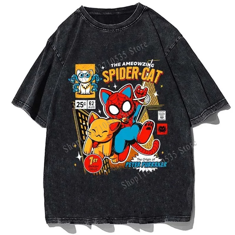 Spider Cat Graphic Printed T-Shirt High Street Streetwear T Shirt Vintage Washed Loose Oversize Tshirt Fashion Cotton Men Tees