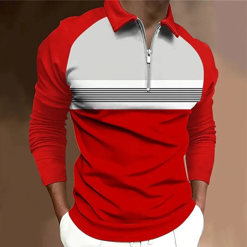 Spring and Autumn Men's Long Sleeve Zipper Polo Shirt Fashion Stripe Design Comfortable Polyester Fiber