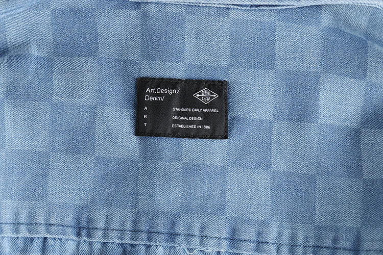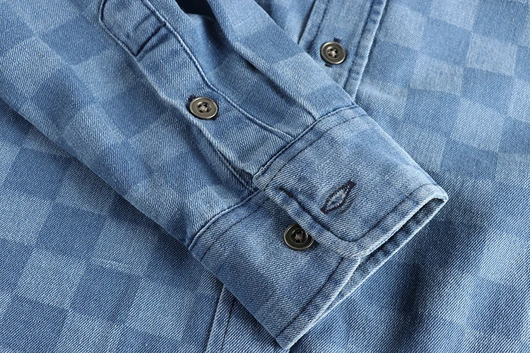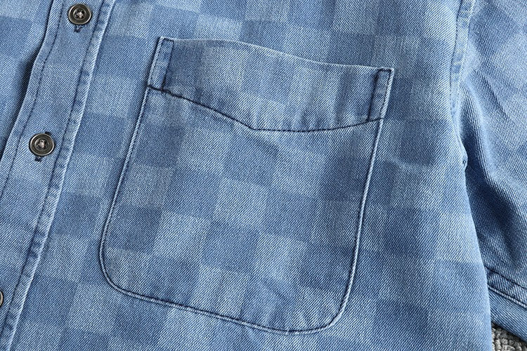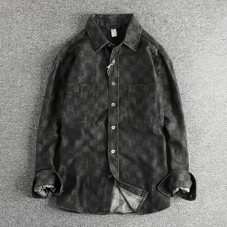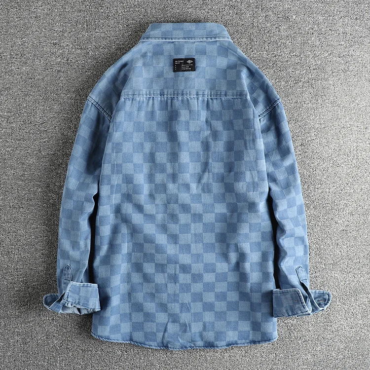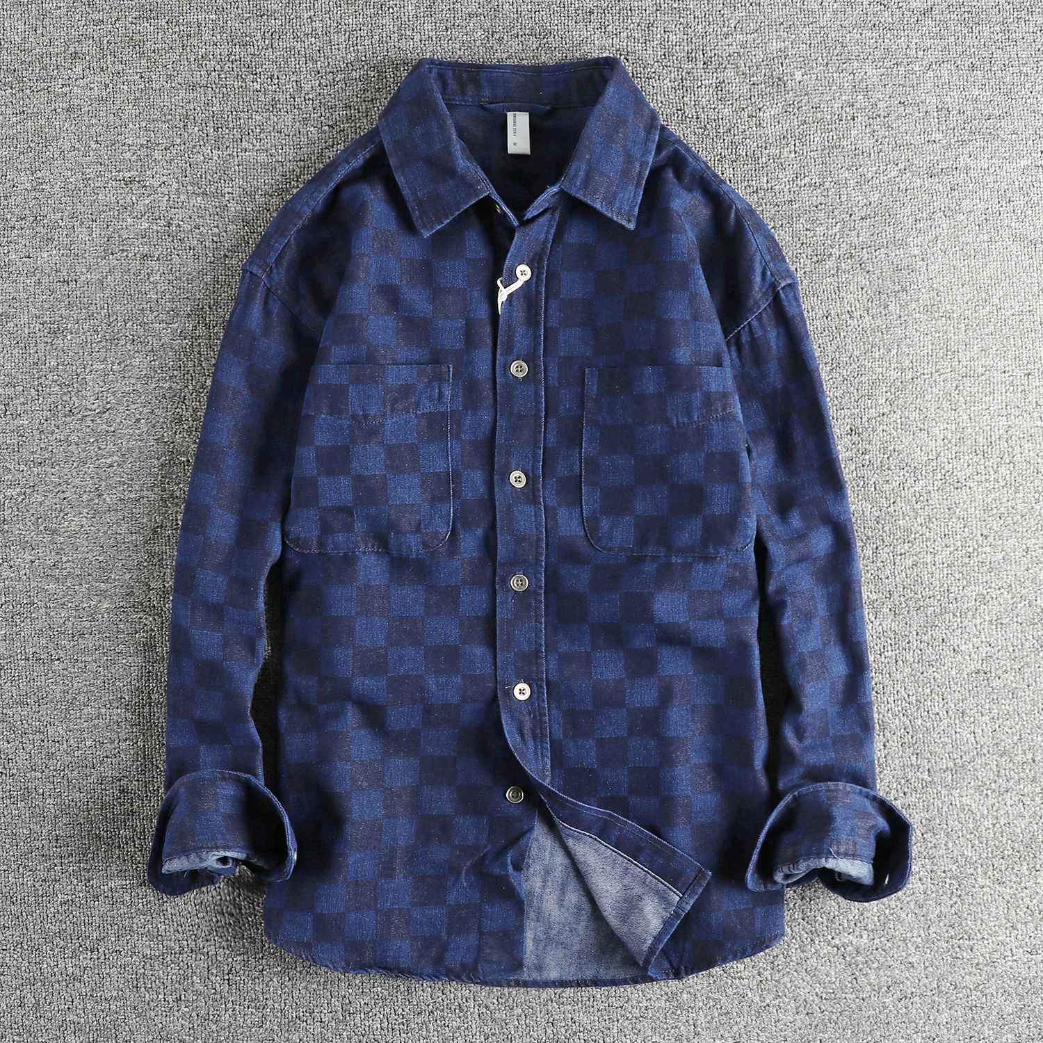 Spring Japanese Retro Long Sleeve Lapel Denim Plaid Cargo Shirts Men's High Street 100% Cotton Washed Loose Casual Thin Jacket