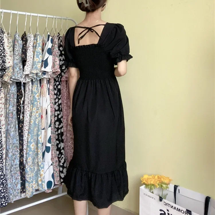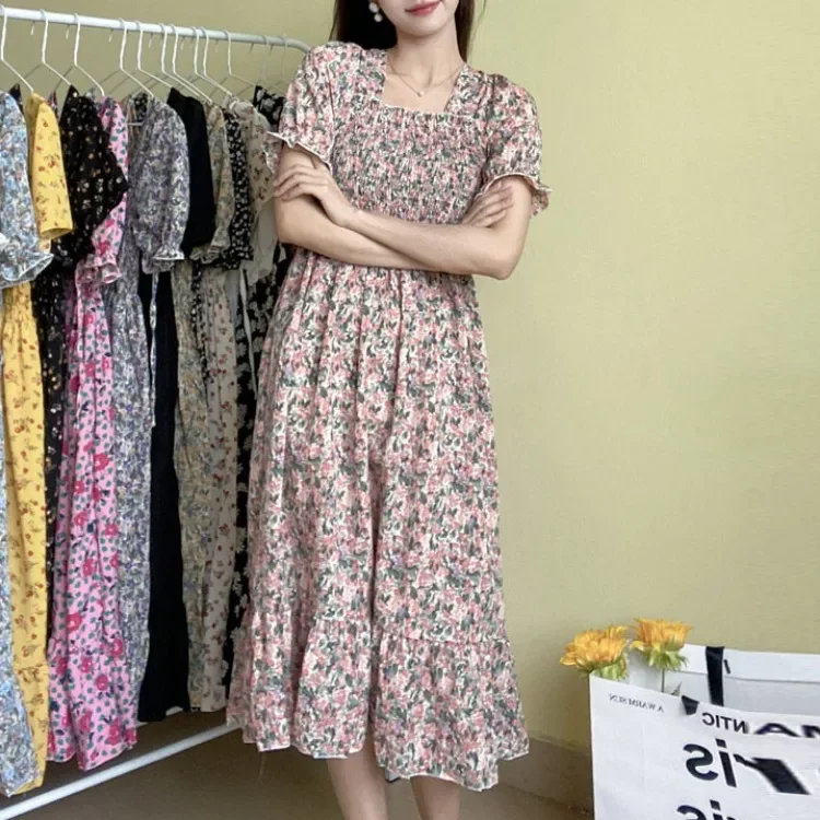 Spring Summer Elastic Waist Chiffon Dress Women Casual Dresses Fashion Female Vestidos Short Sleeve Pleated A-line Dresses