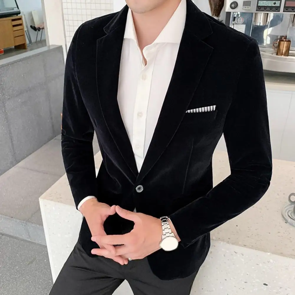 Spring Velvet Men Solid Color Temperament Suit Jacket Turndown Collar Long Sleeve Slim Fit Single Button Velvet Suit Coat
