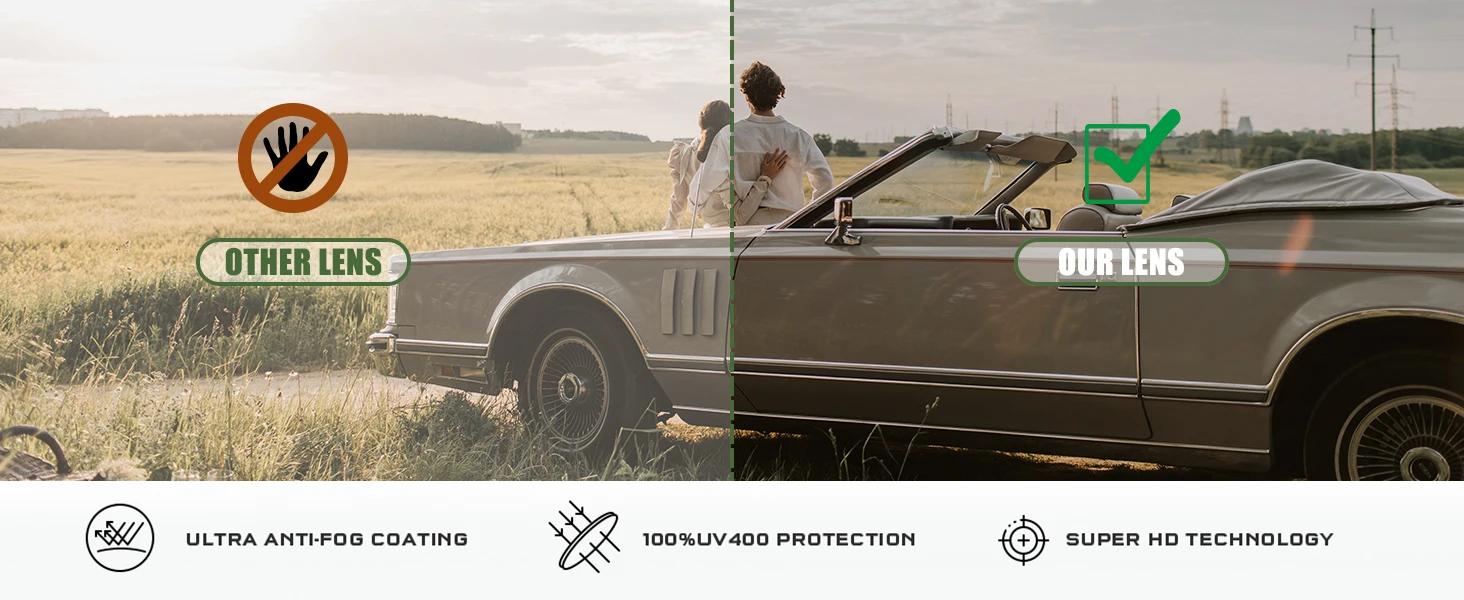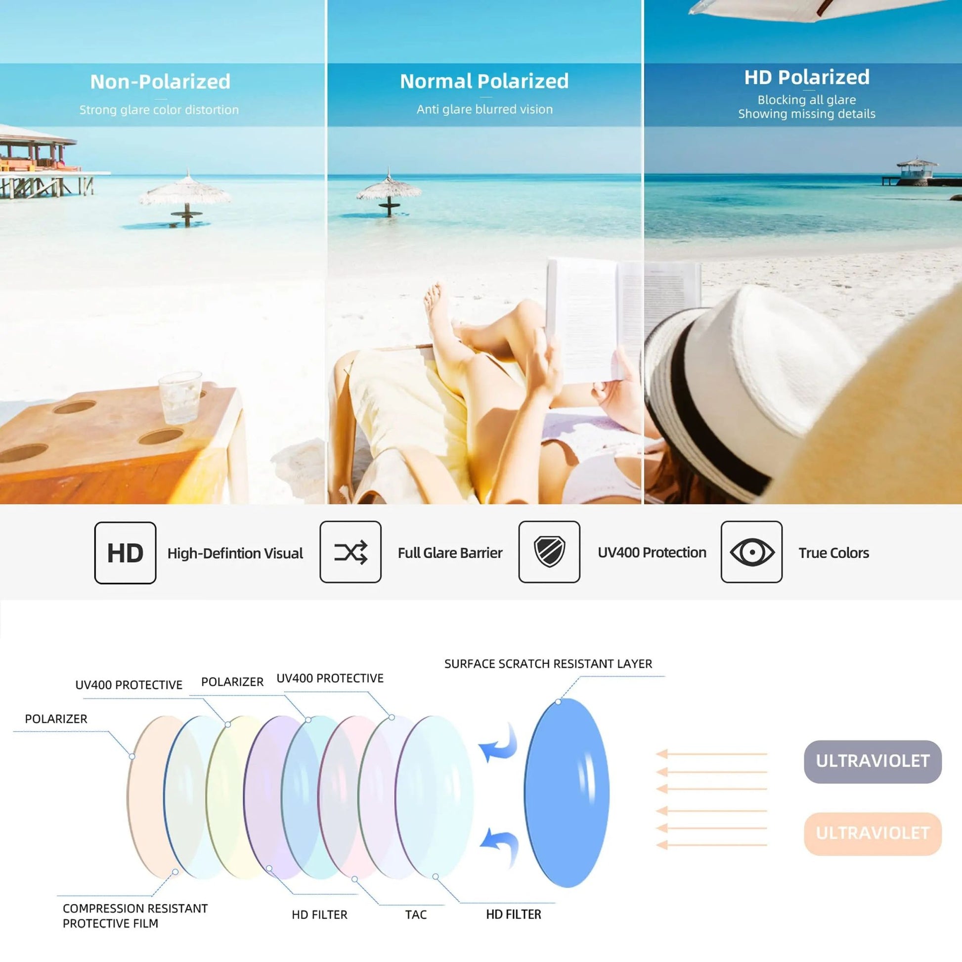 POLARIZED LENS - Polarized sunglasses reduce glare reflected off of roads, bodies of water, snow, and other horizontal surfaces. Restore true color, eliminate reflected light and scattered light and protect eyes perfectly. Polarized sunglasses cut glare and haze so your eyes are more comfortable and you can see better.
