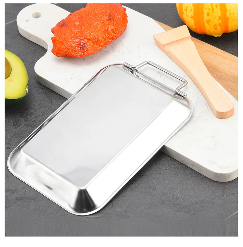Stainless Steel Rectangle Plate Removable Anti-scalding Wooden Handle Tray Barbecue Grill for Outdoor BBQ Sushi Tray, Cake Tray