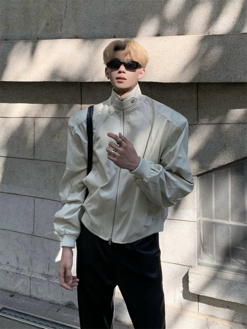 Stand Up Collar Design PU Leather Jacket Men's Retro Shoulder Pad Motorcycle Short Jacket Top