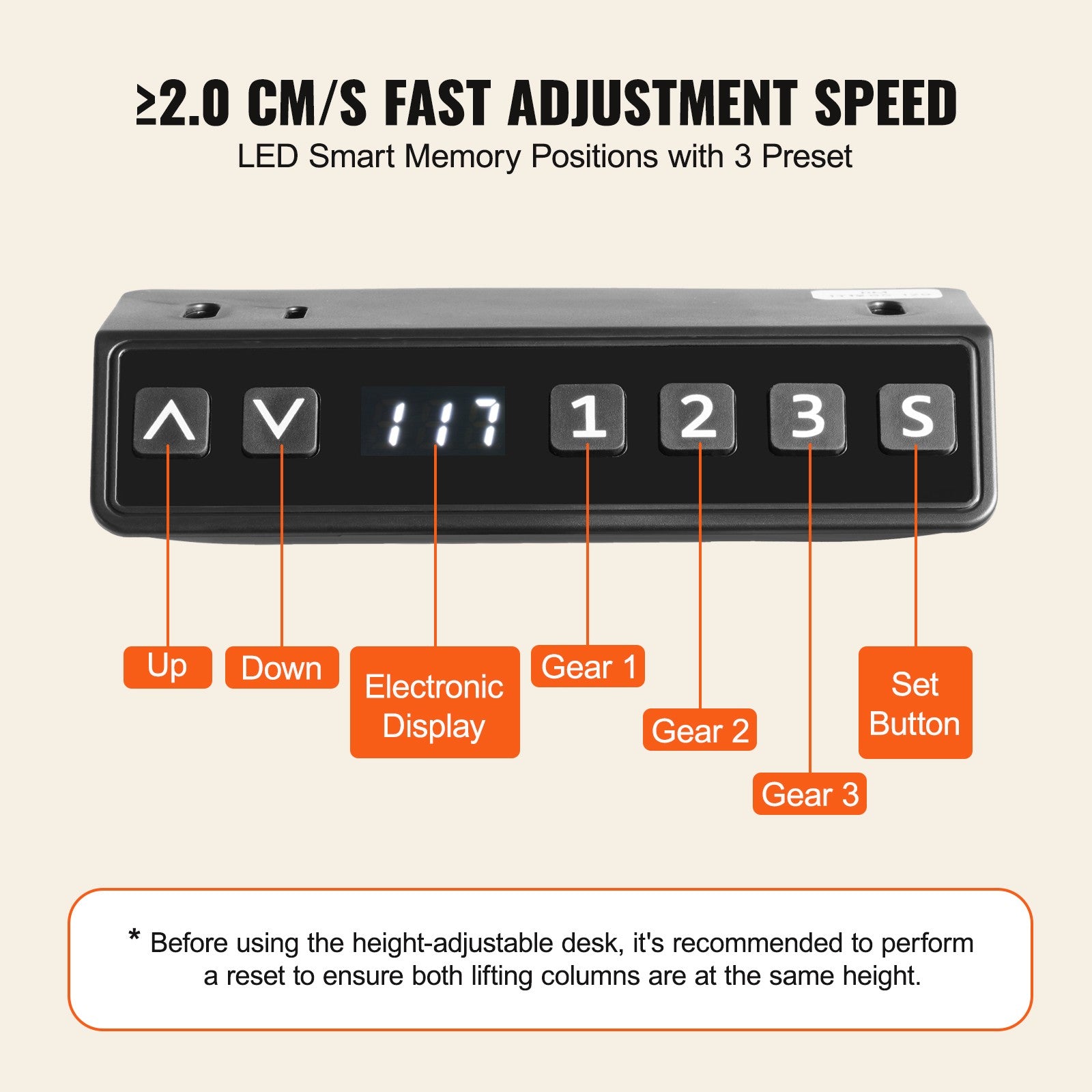 Rapid Height Adjustment: Experience swift transitions with a lifting speed of ?0.79/1.26 in /s (2.0/3.2 cm/s), complemented by an LED controller capable of memorizing three preset heights for easy toggling between work modes. The intuitive button interface for charging make operation a breeze.