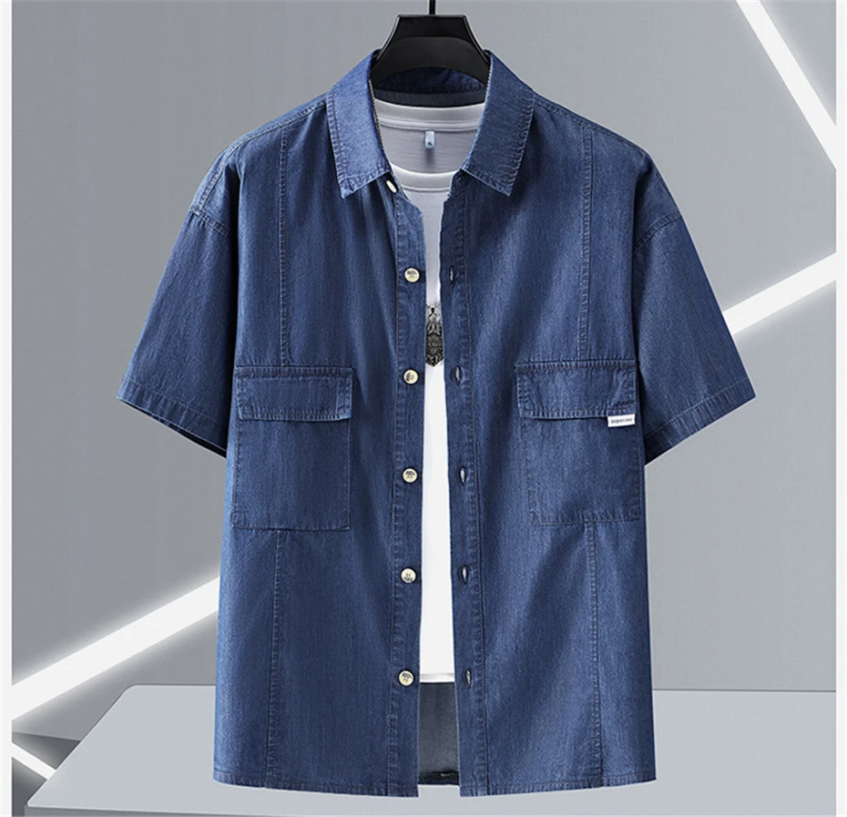 Summer Denim Shirt Men Short Sleeve Denim Shirts Jackets Male Plus Size 10XL Jean Shirts Blue Solid Color Tops Summer