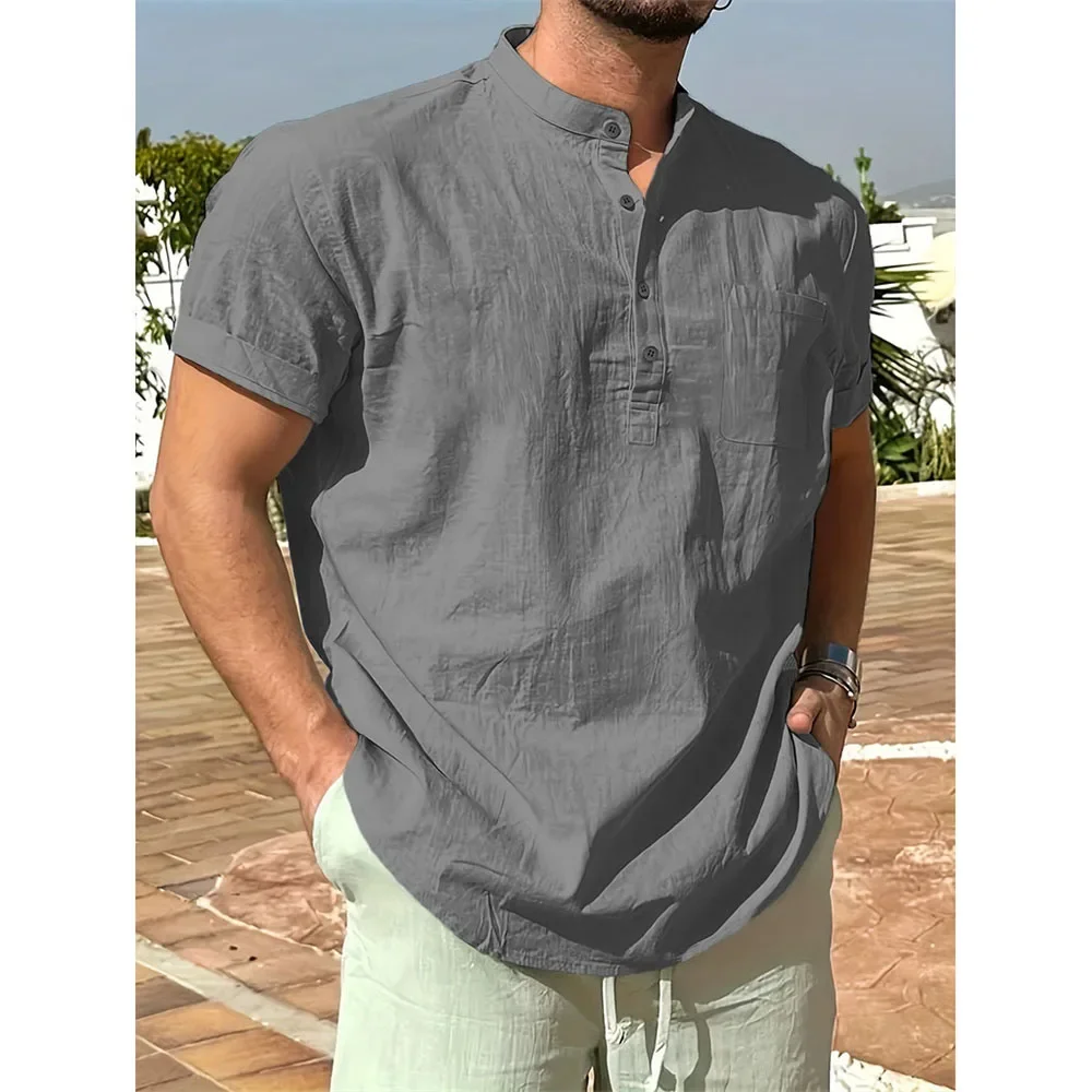 Summer Hot Sale Men's Cotton Linen T-shirt Henley Neck Casual Breathable Lightweight Solid Color Pocket Fashion Button Tops