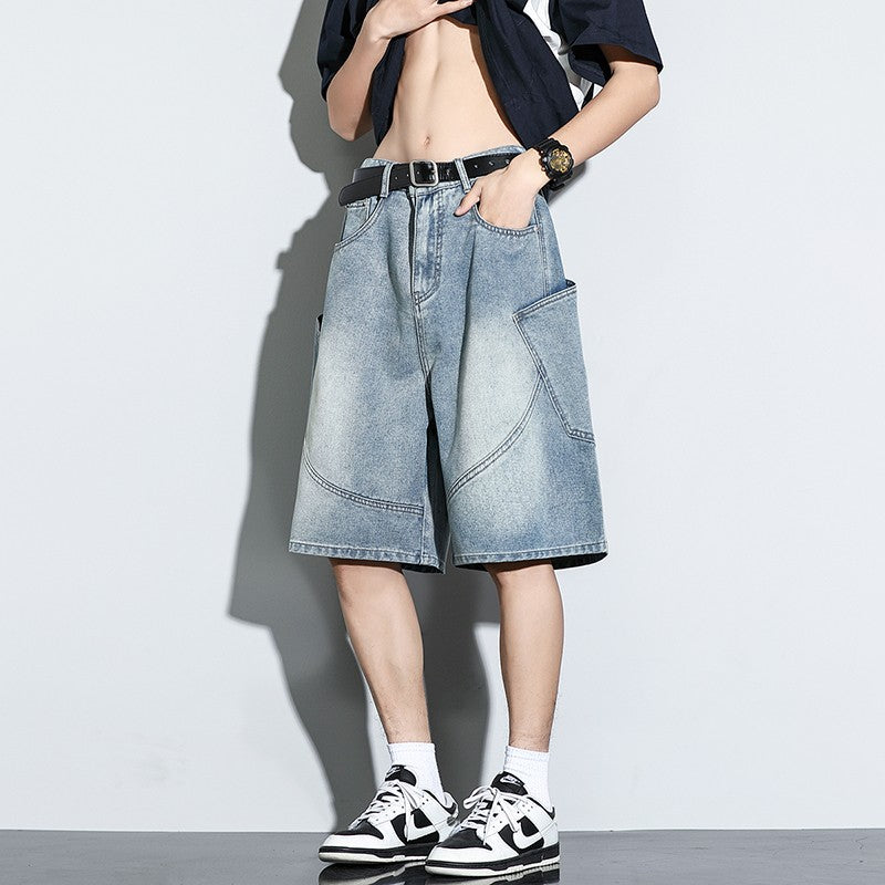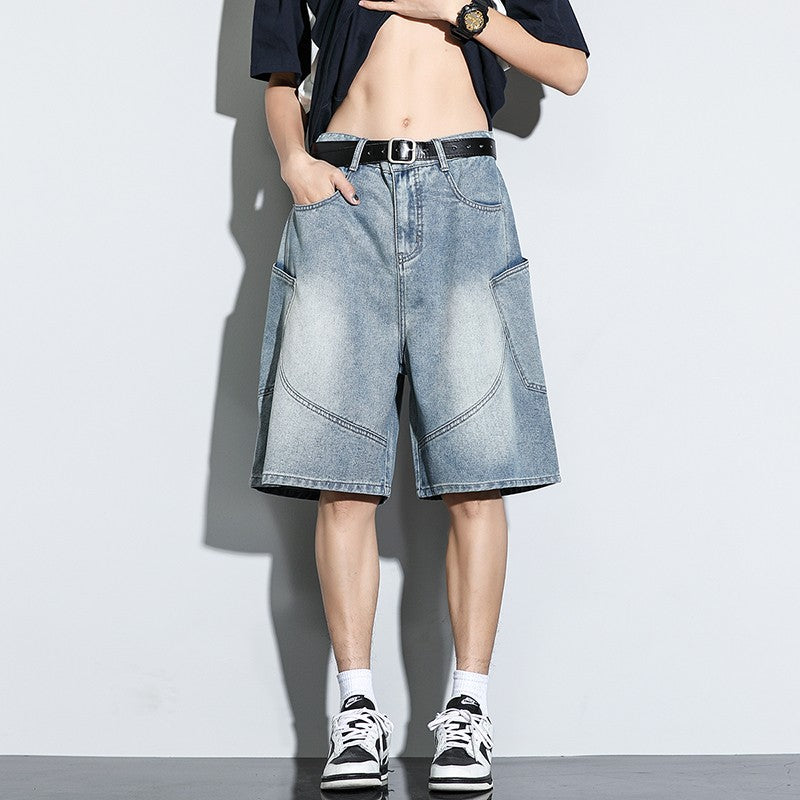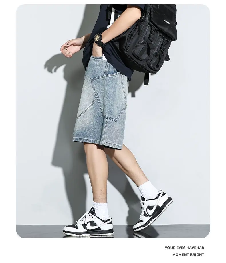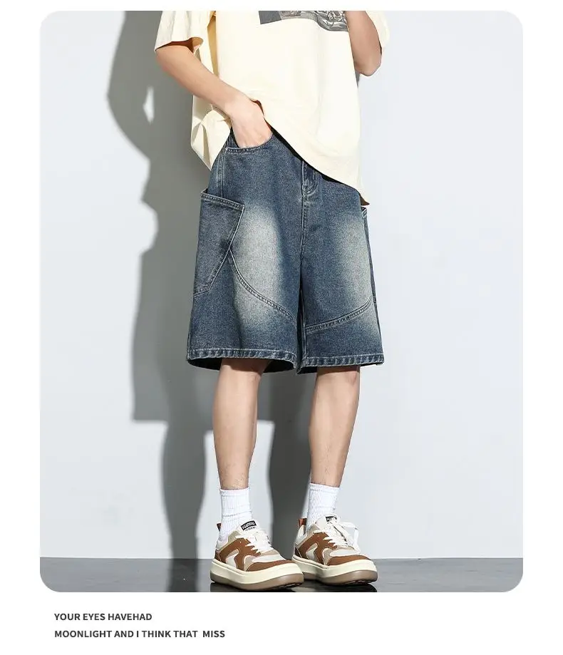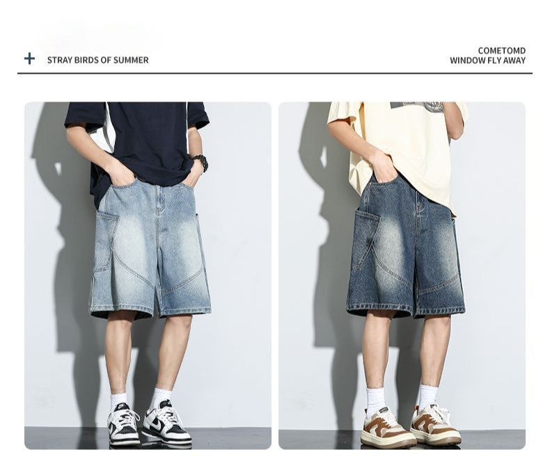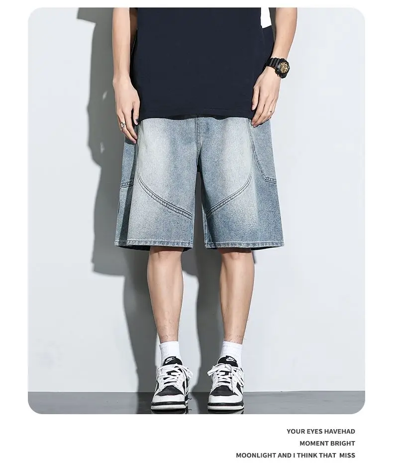 Summer New Baggy Denim Shorts Fashion Casual Straight Harajuku Jeans Male Vintage Wash Drawstring Short Pants Streetwear