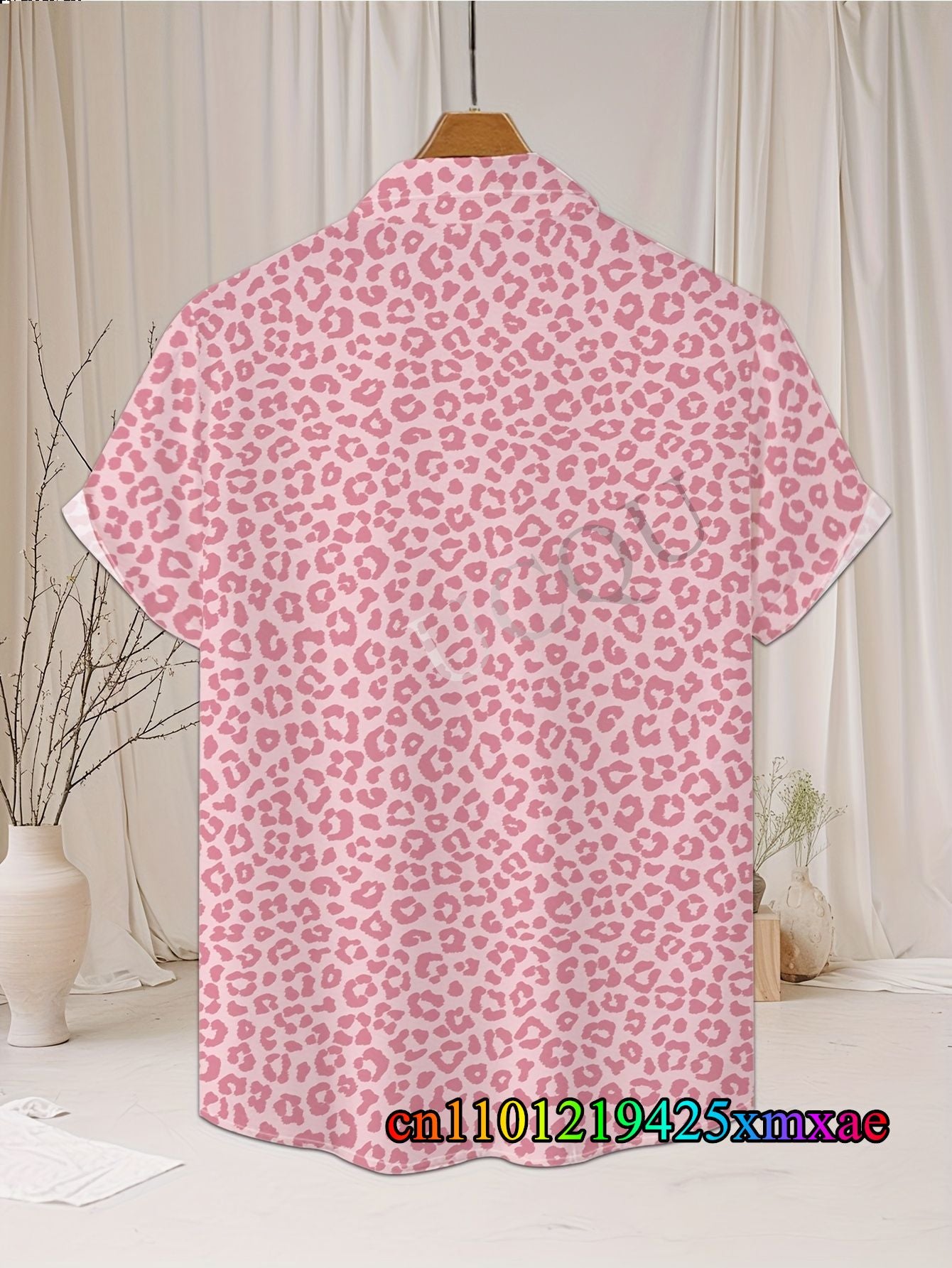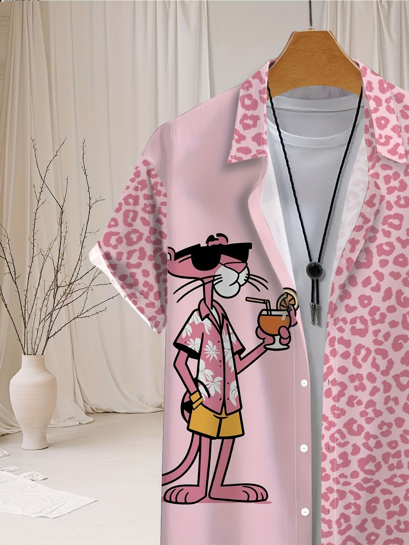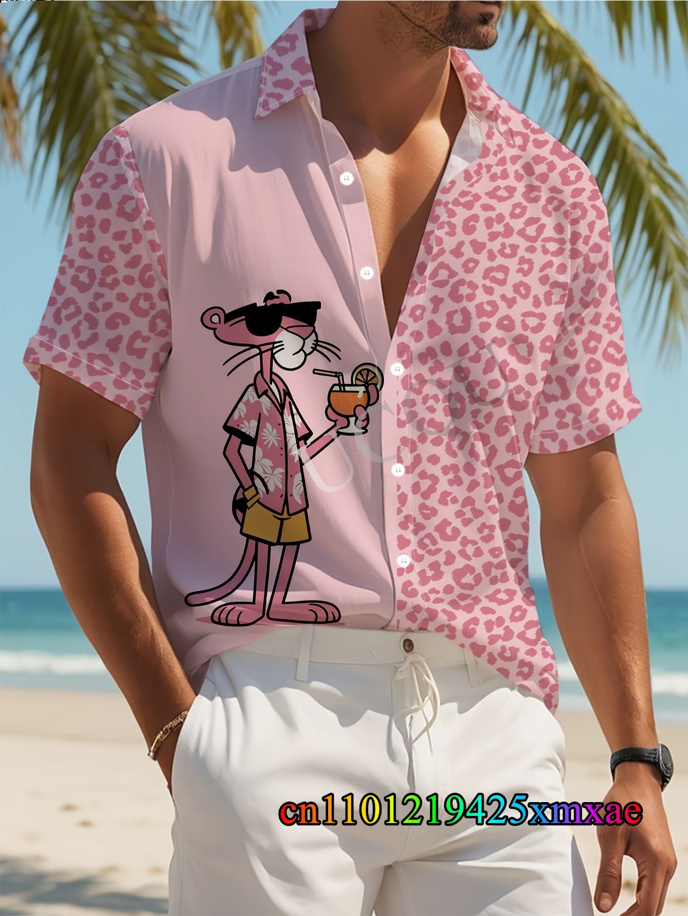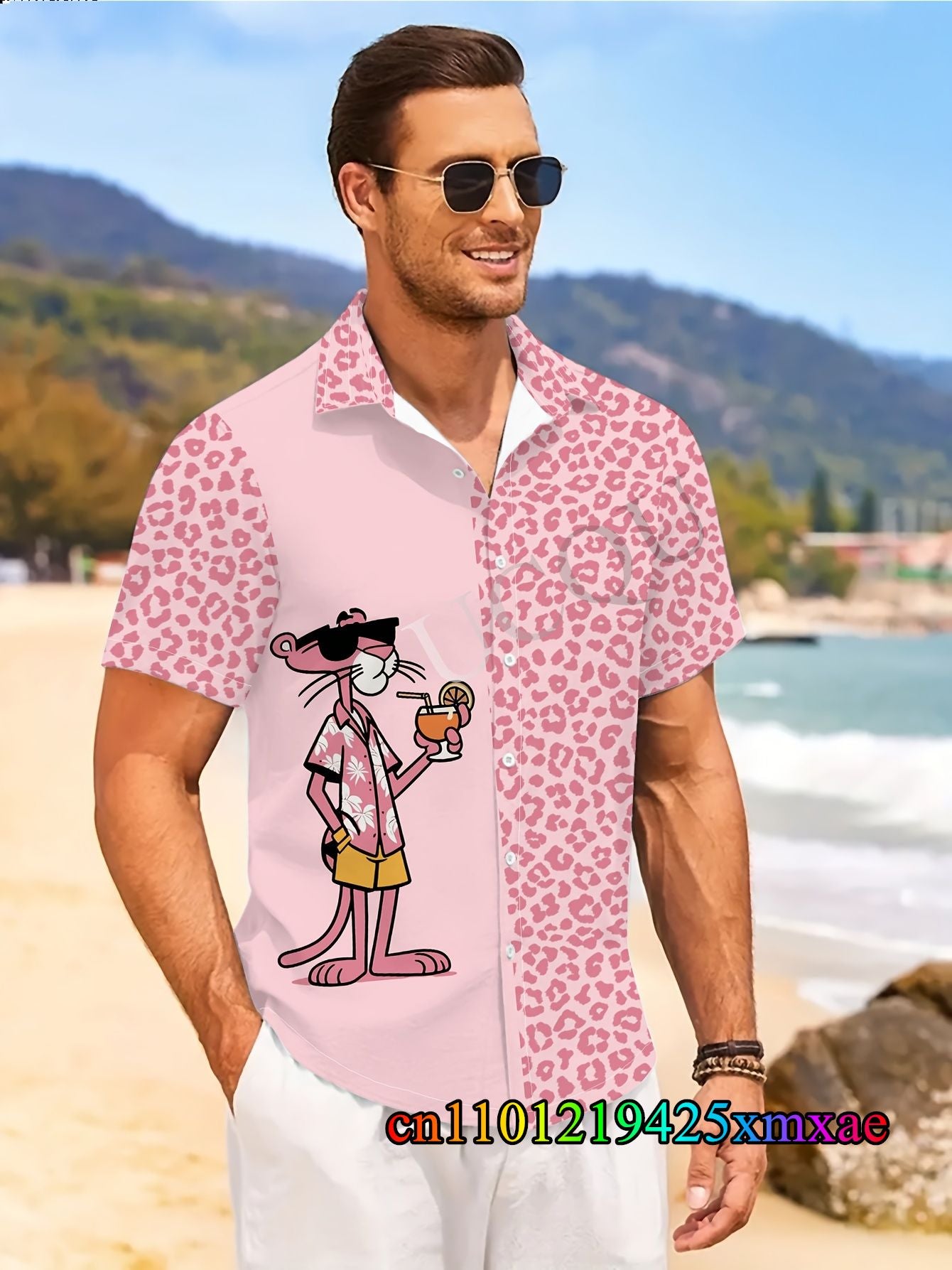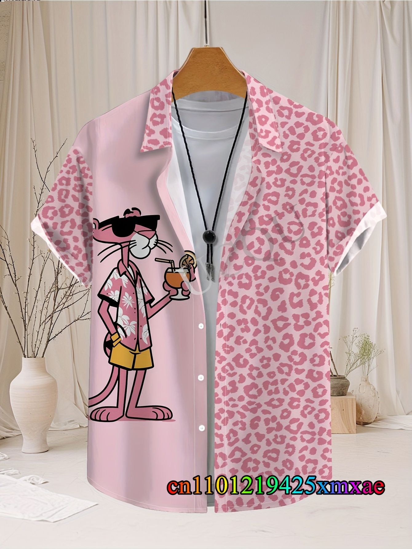 Summer New Men's Lapel Short Sleeve Hawaiian Shirt Leopard & Pink Panther Print Hawaii Vacation Casual Fashion Kids/Adult Tops