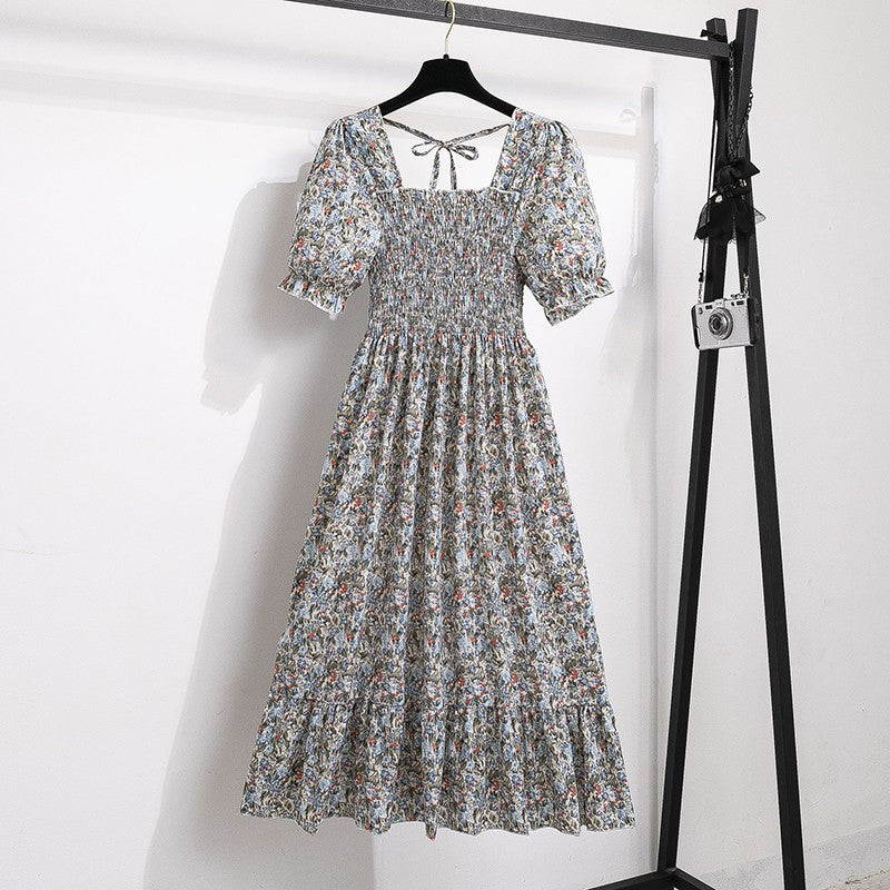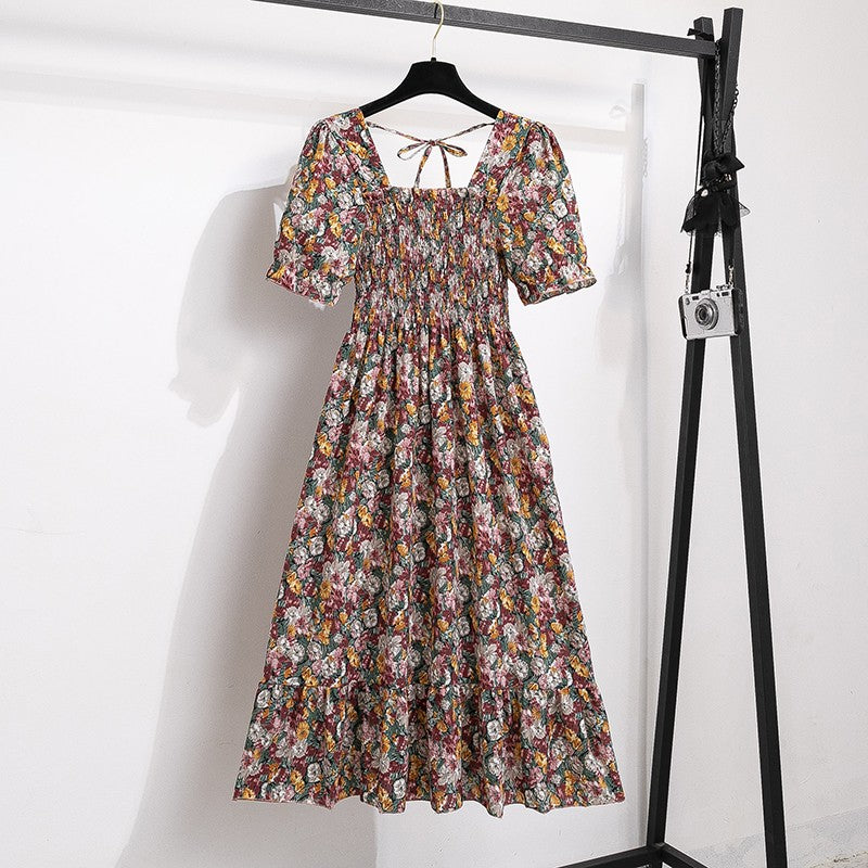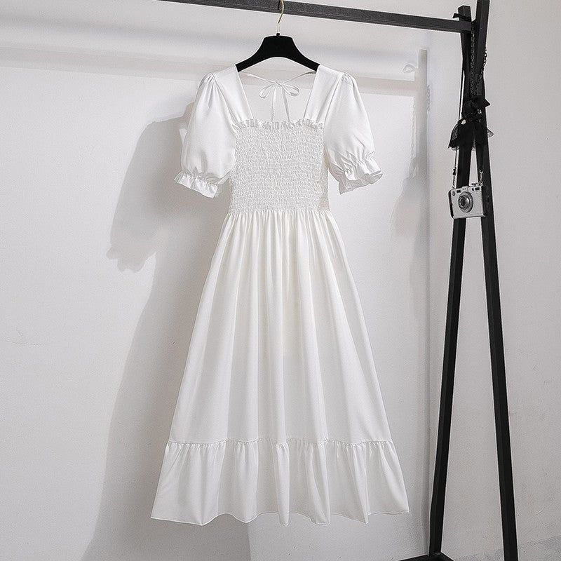 Summer Pleated Women Chiffon Dresses Casual Beach Holiday Short Sleeve Square Co