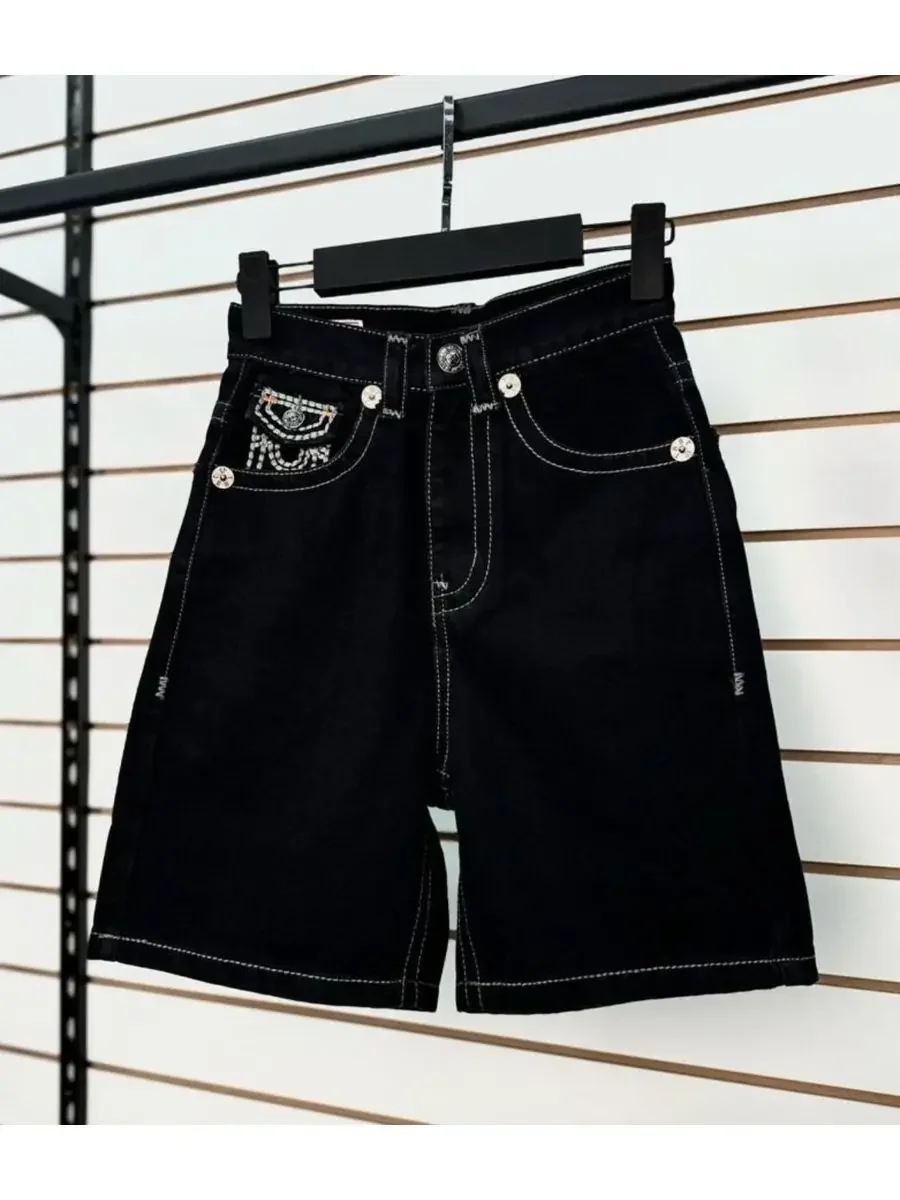 Summer retro black pocket embroidery simple mid-length trousers men's Harajuku street wear y2k trendy washed loose denim shorts