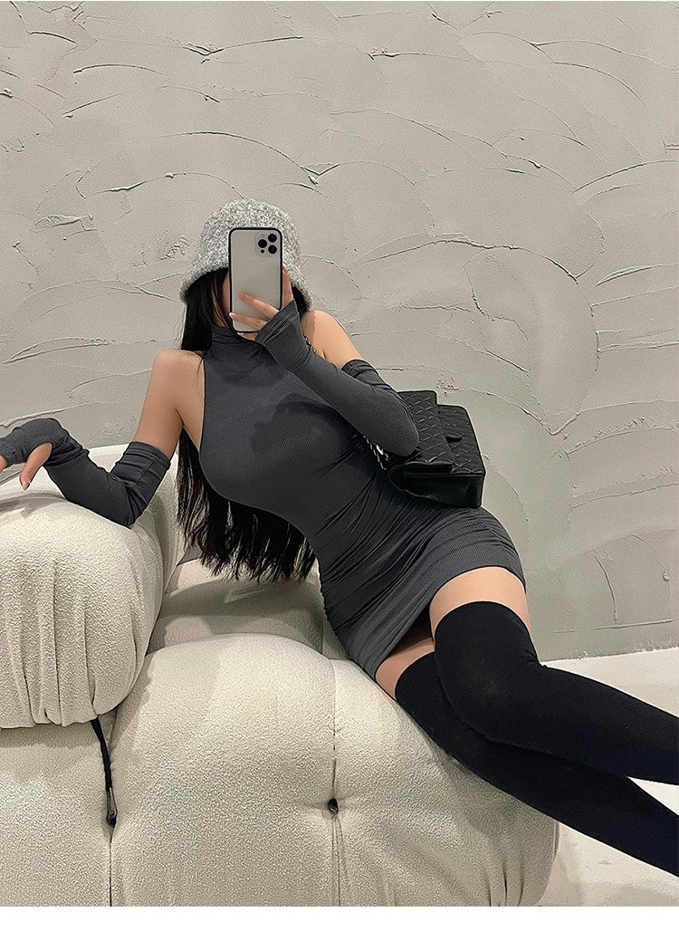 Summer Sexy High Neck Tight Dress Oversleeve Pleated Bottom Wrapped Hip Dress Wo