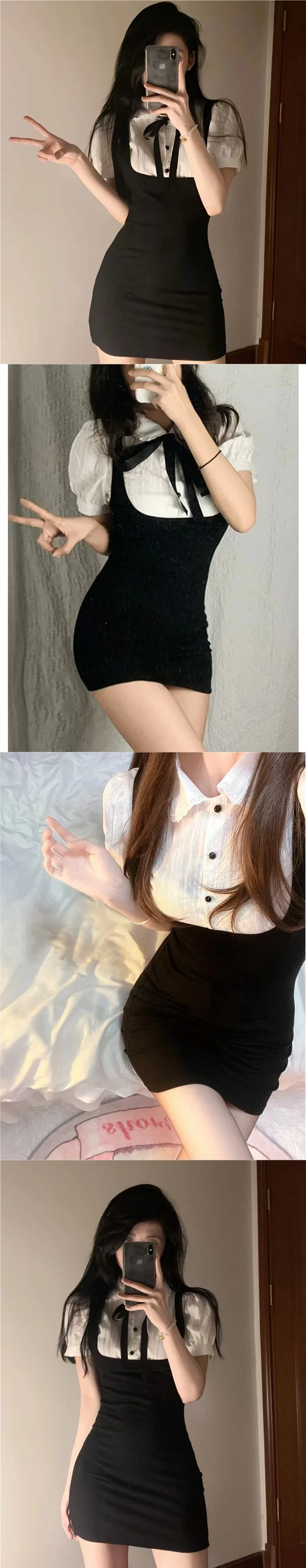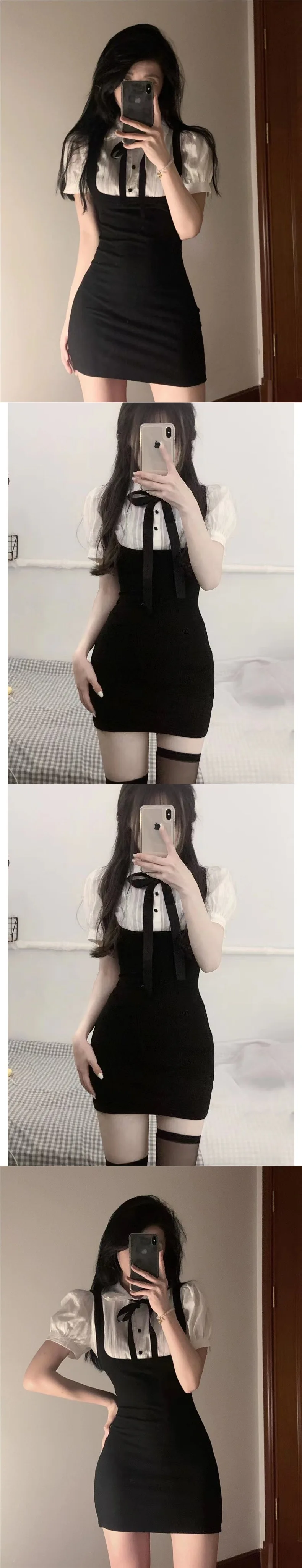 Summer Slimming Black White Splice Mini Dress Trendy Girl Outerwear Base College Style Patchwork Elegant Dress Princess Sleeve P