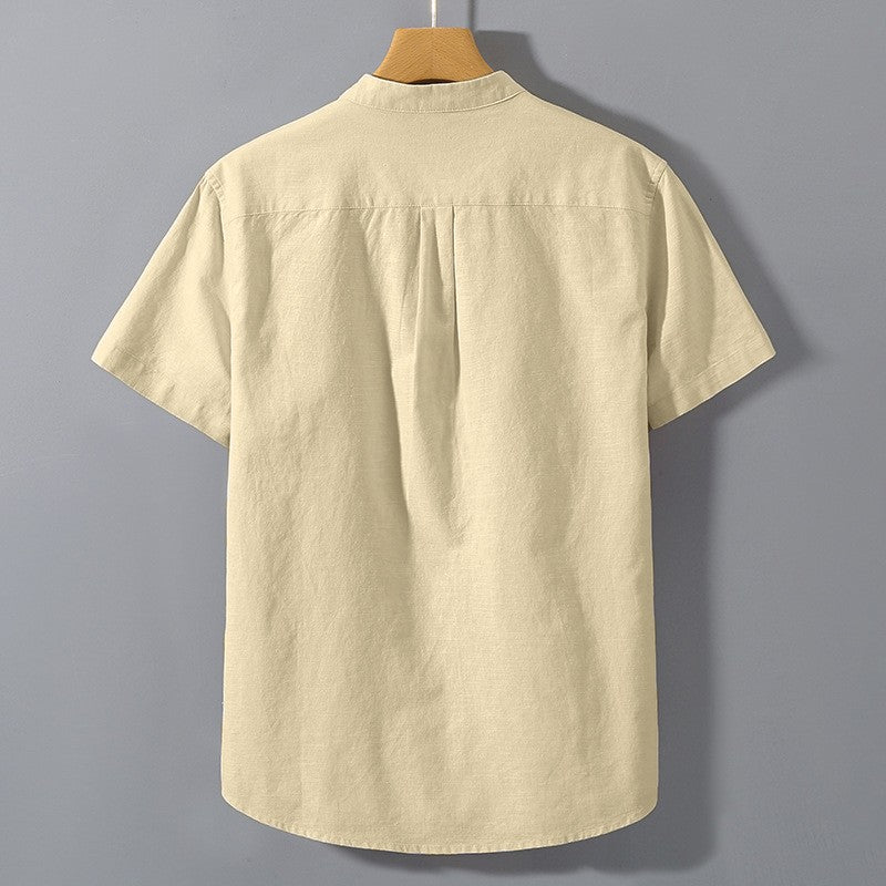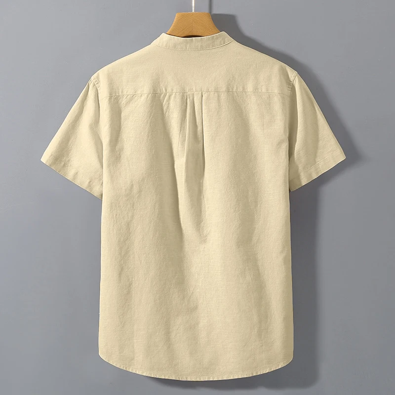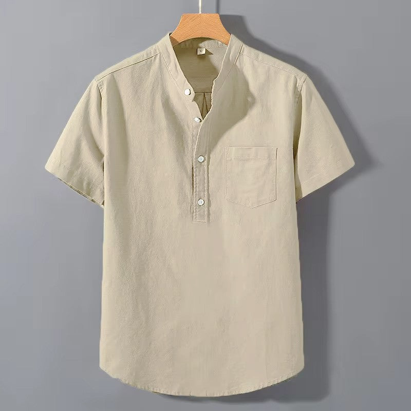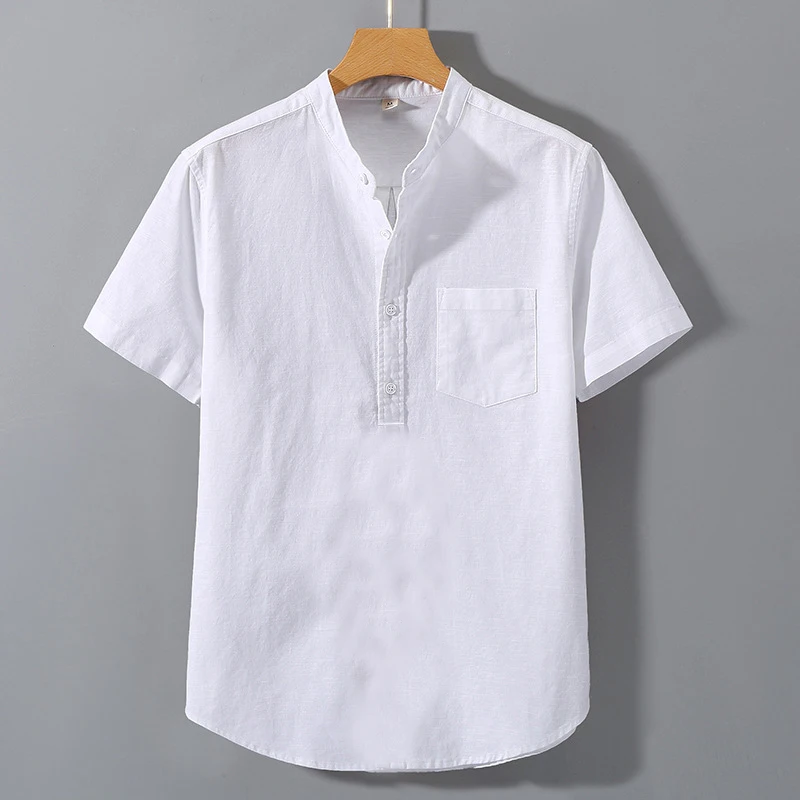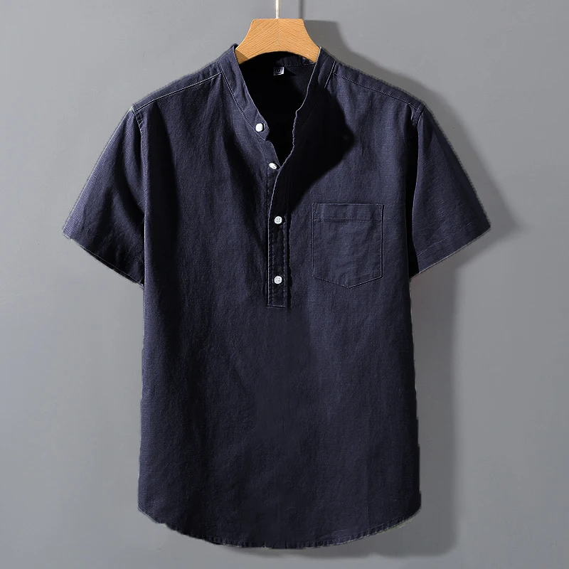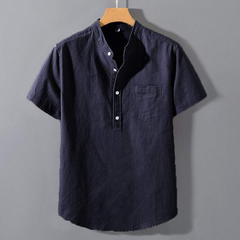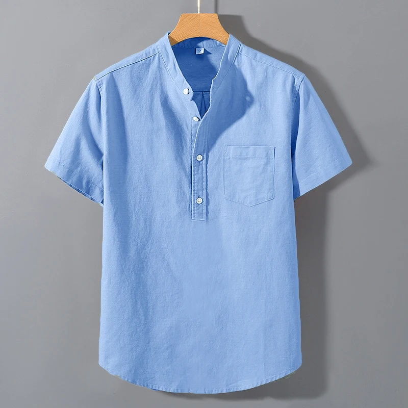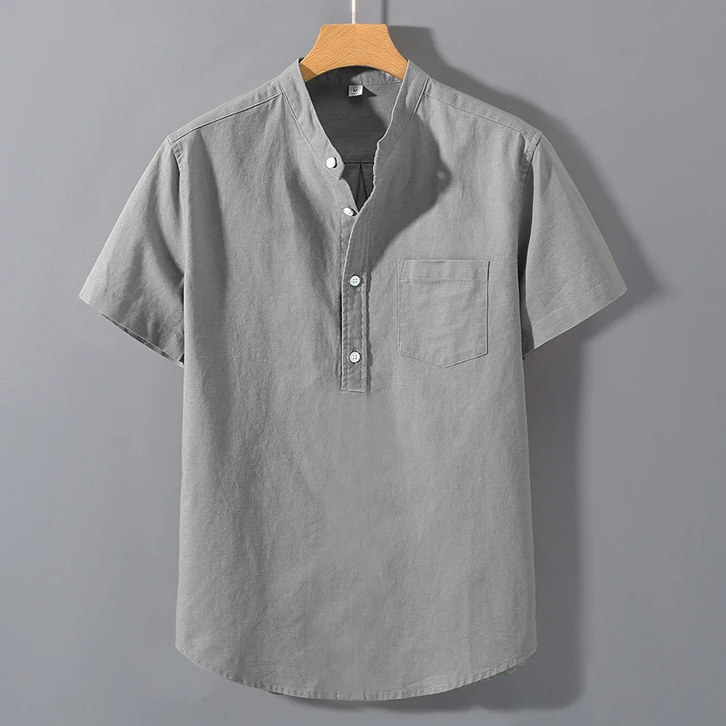 Summer Stand Up Collar T Shirts Solid Color Short Sleeve Cotton Shirt Trendy Breathable Loose Youth Basic Pocket Top