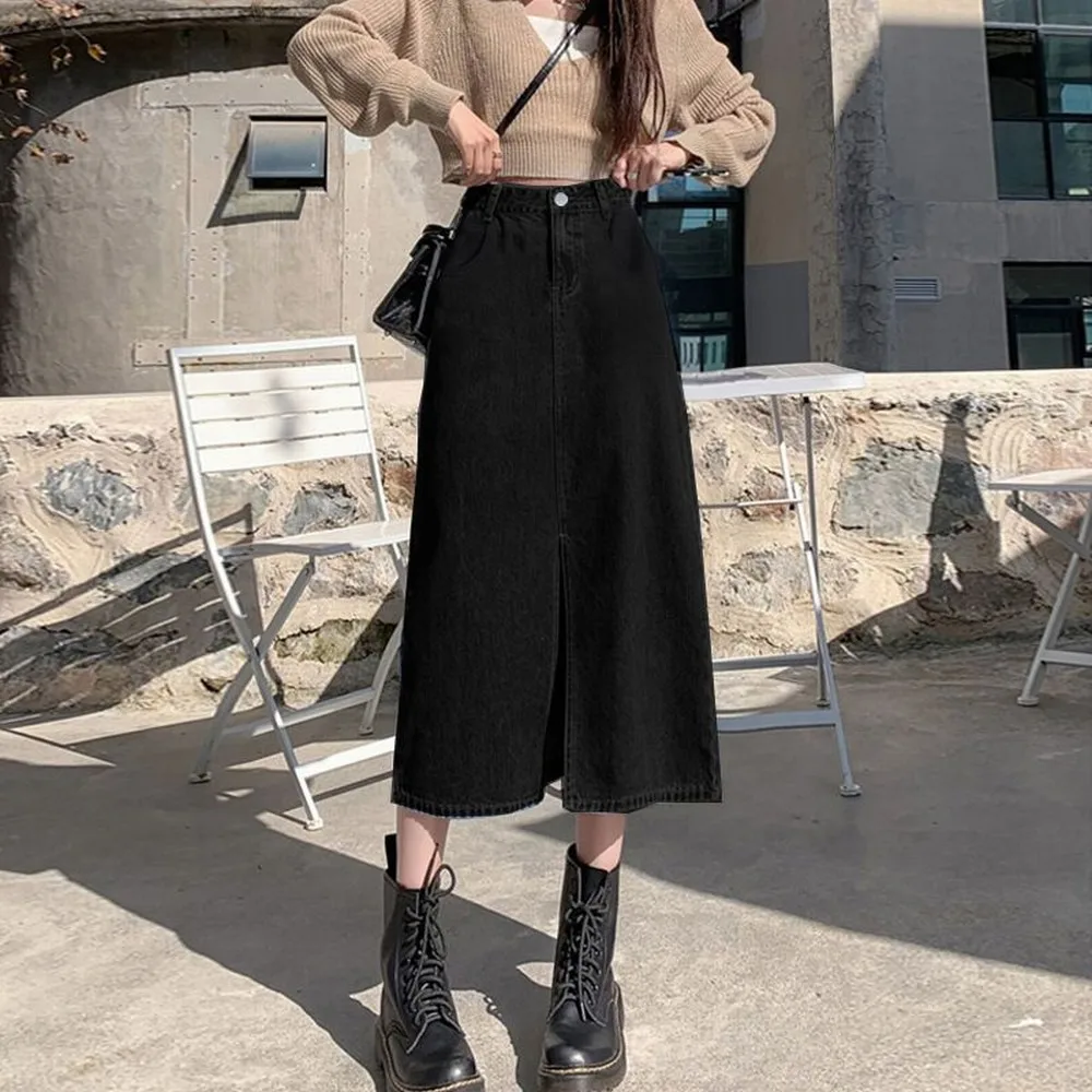 Summer Women High-waist Retro A- line Skirt Pockets Front Slit Washed Blue Denim Skirts Hip-covering Straight Long Jeans Skirt
