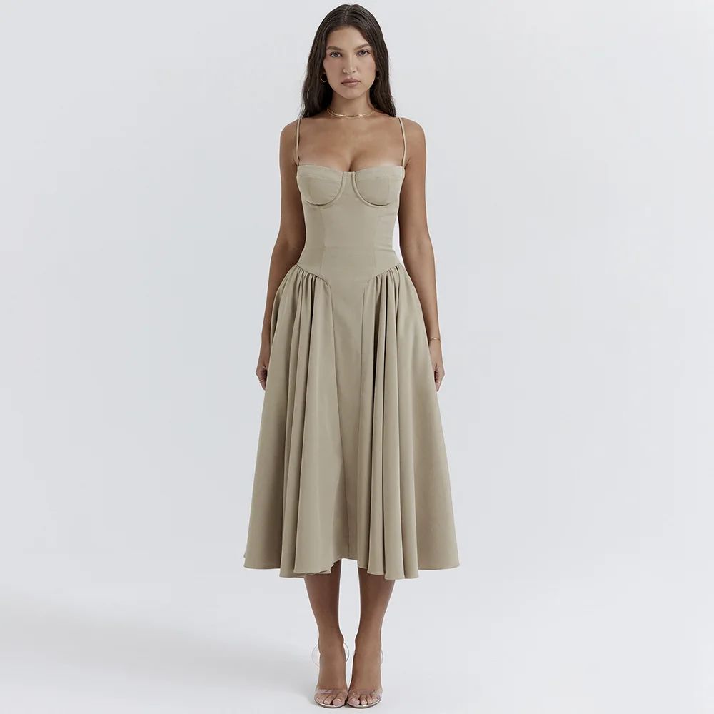 Suninheart Elegant Spaghetti Strap Midi Dress Slim A Line Party Dresses Navy Blu