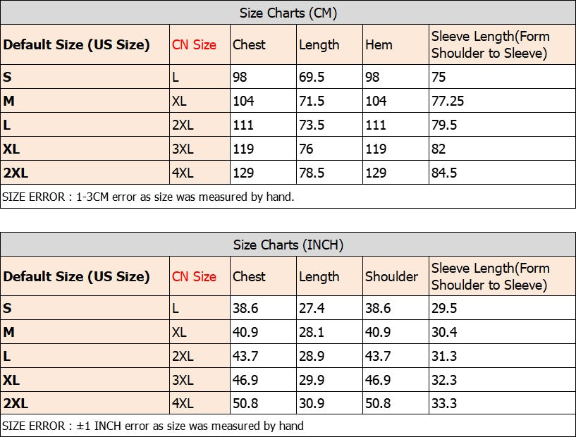2. Size chart is measurement of outer clothes, which may have 1-3 cm errors, since measured by hands.