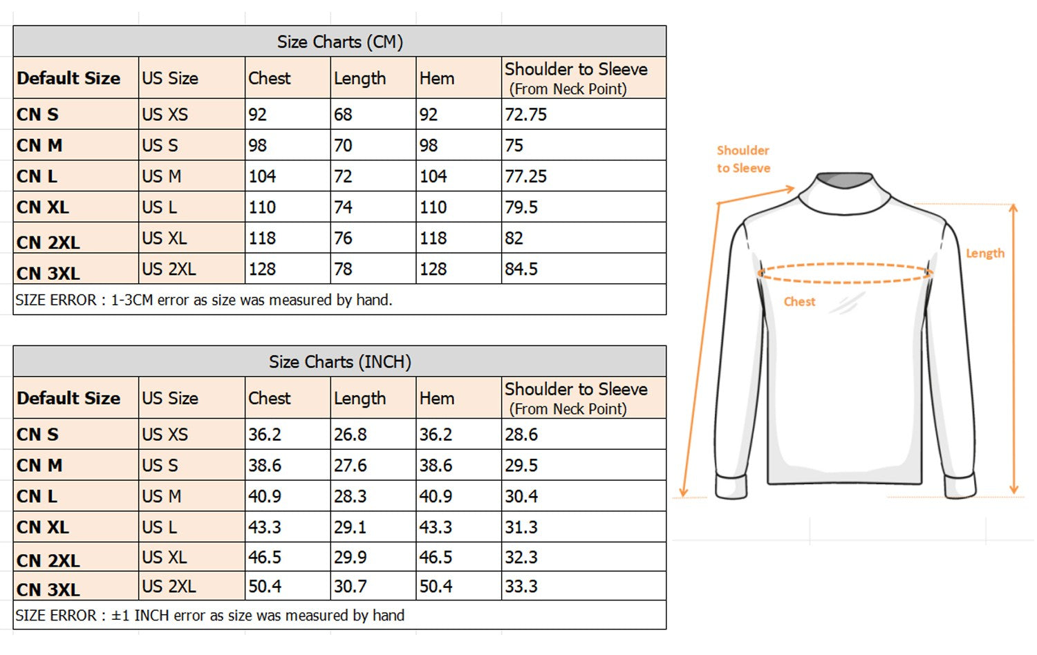2. Size chart is measurement of outer clothes, which may have 1-3 cm errors, since measured by hands.