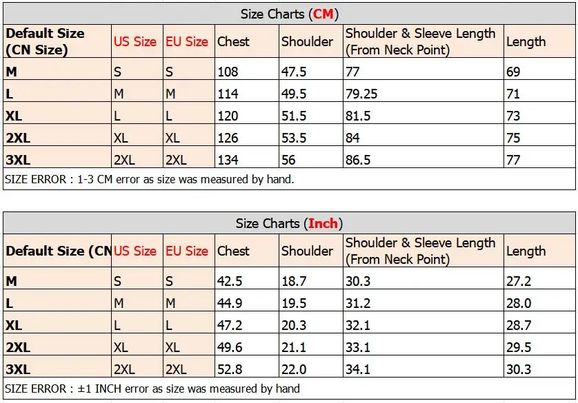2. Size chart is measurement of outer jacket, which may have 1-3 cm errors, since measured by hands.