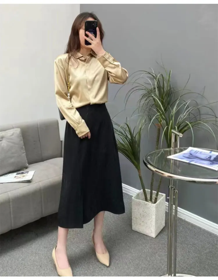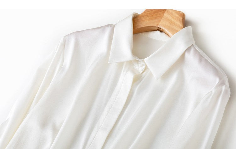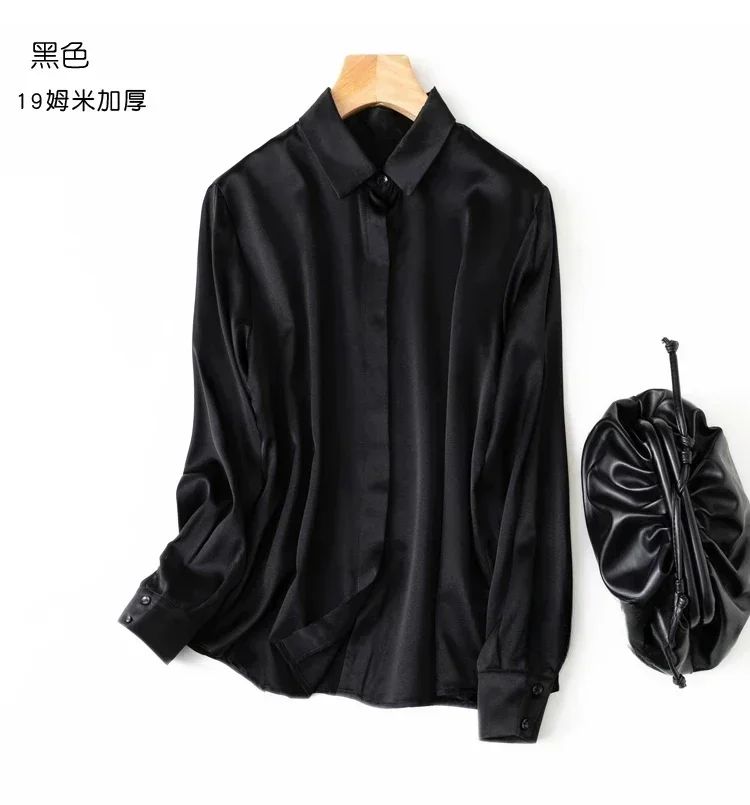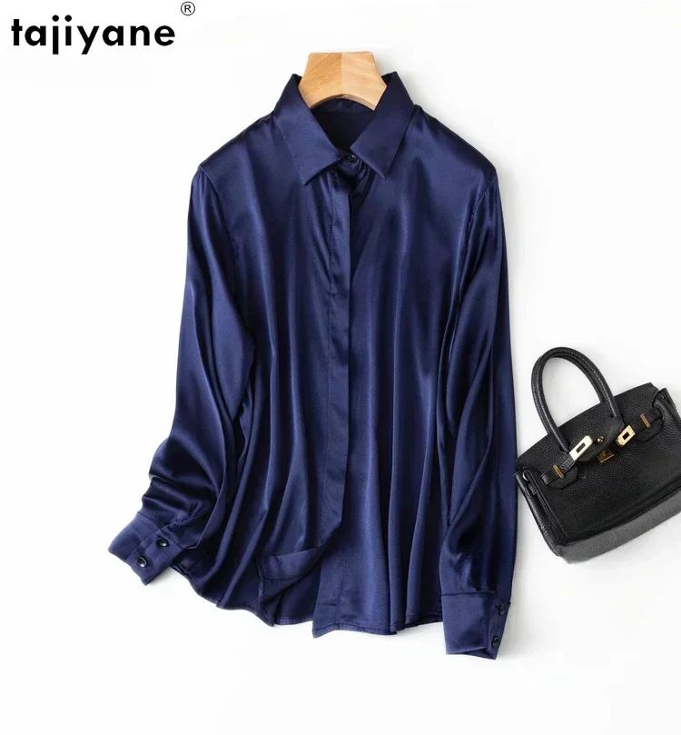 Tajiyane Women's 93% Mulberry Silk 7% Spandex 19 momme satin Silk Buttons long sleeve shirt Top Blouse office work chemise femme