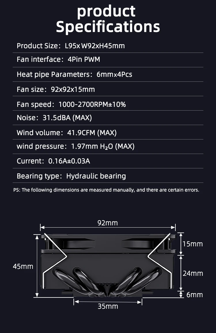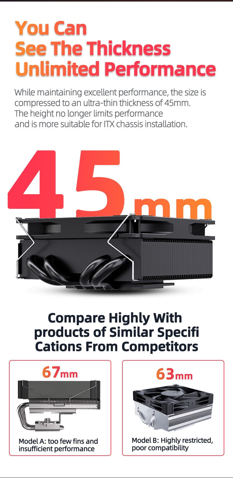 Ultra-slim and Compact: With a height of only 45mm, the cooler fits perfectly into the tight ITX chassis environment without obstructing the installation of large graphics cards or other components, providing a powerful cooling solution in a limited space, ideal for building a small, high-performance PC.