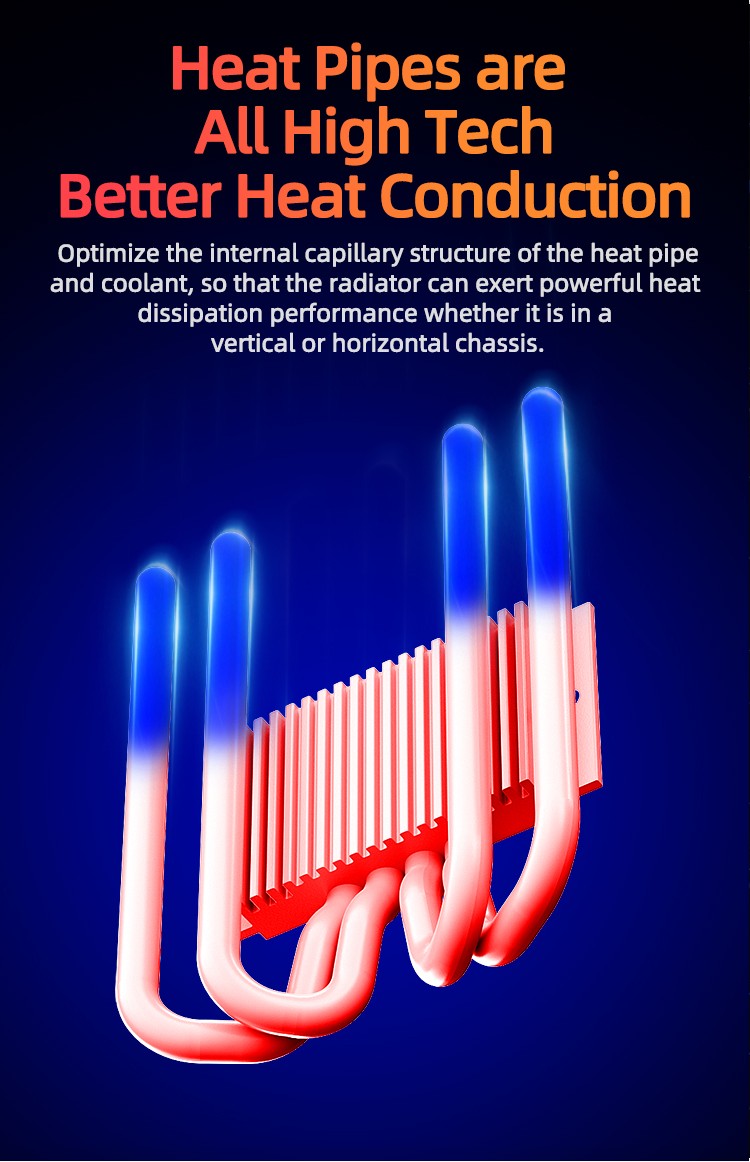 High-efficiency cooling design: Adopting 4 high-performance pure copper heatpipes, which are tightly connected to the cooling fins through precise soldering process, the heat generated by the CPU is effectively transferred to ensure that good temperature control is maintained even under high loads, and supports TDP up to 130W, which is suitable for the cooling needs of most mid-range and high-end processors.