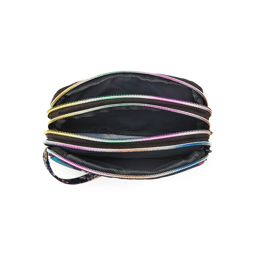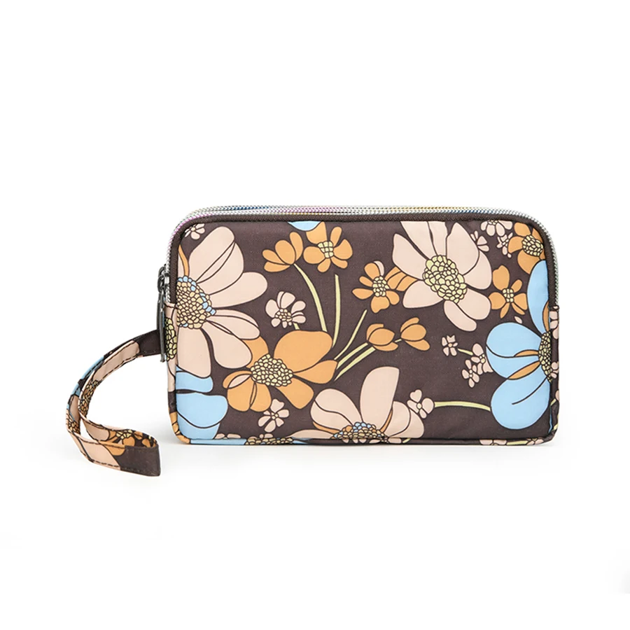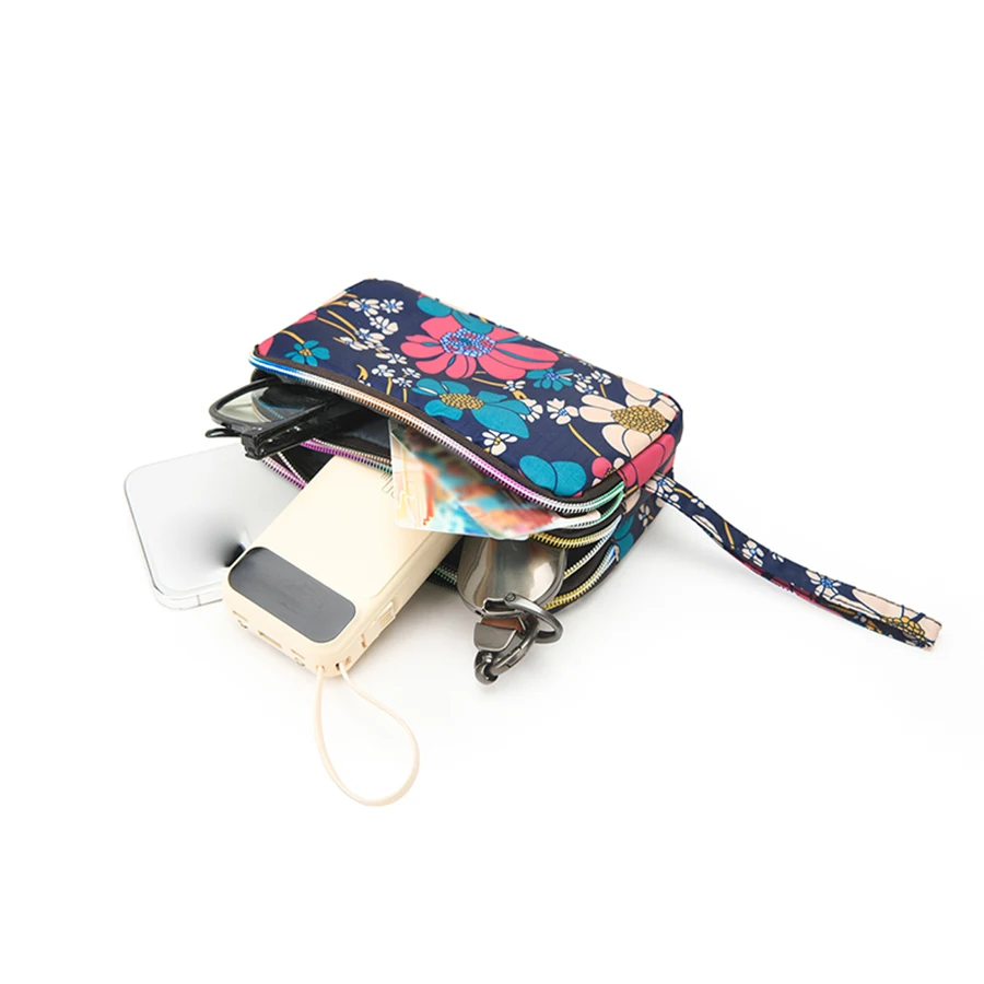 The fashionable lady's clutch and mobile phone bag are rich in floral patterns and elements, and the fabric is soft