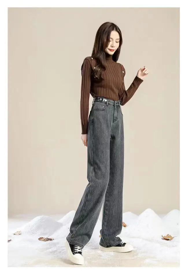 Thickened Fleece Lined Retro Women's Wide Leg Jeans Winter New Style Hong Kong Flavor Small Size Straight Cut Warm Trousers