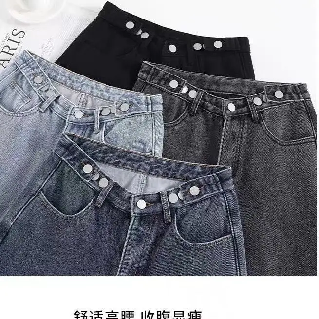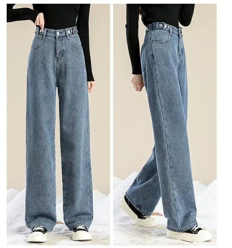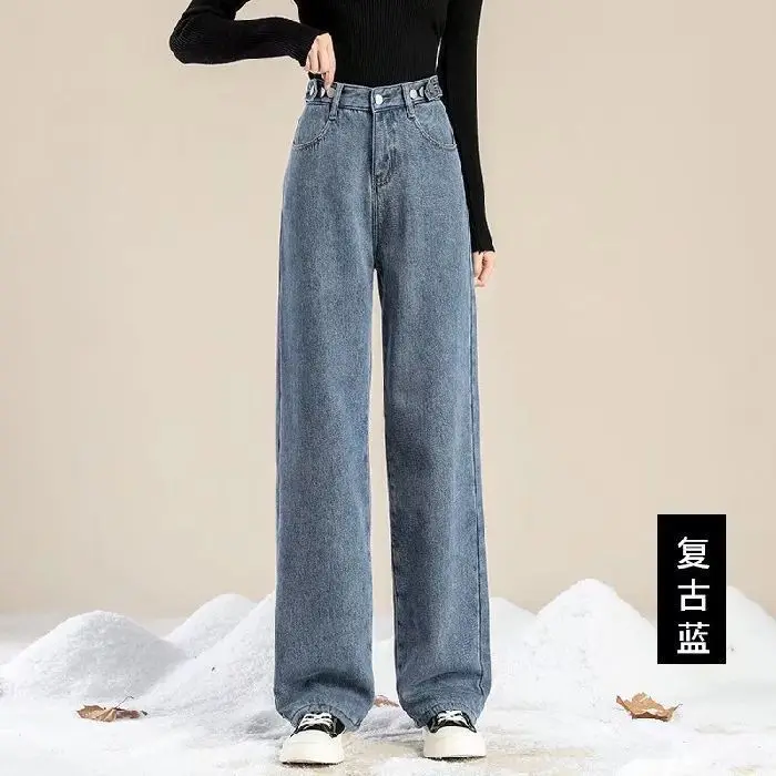 Thickened Fleece Lined Retro Women's Wide Leg Jeans Winter New Style Hong Kong Flavor Small Size Straight Cut Warm Trousers