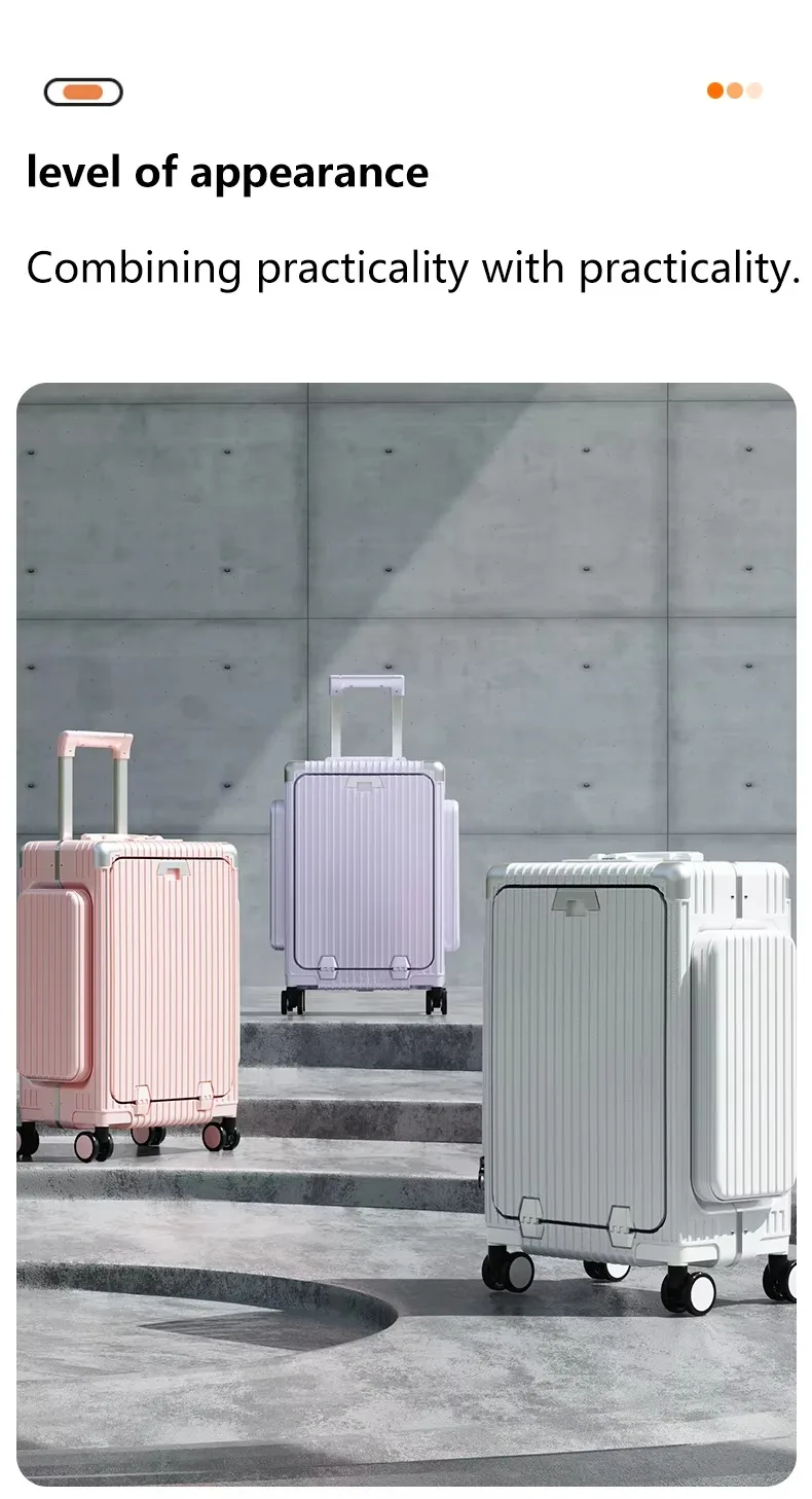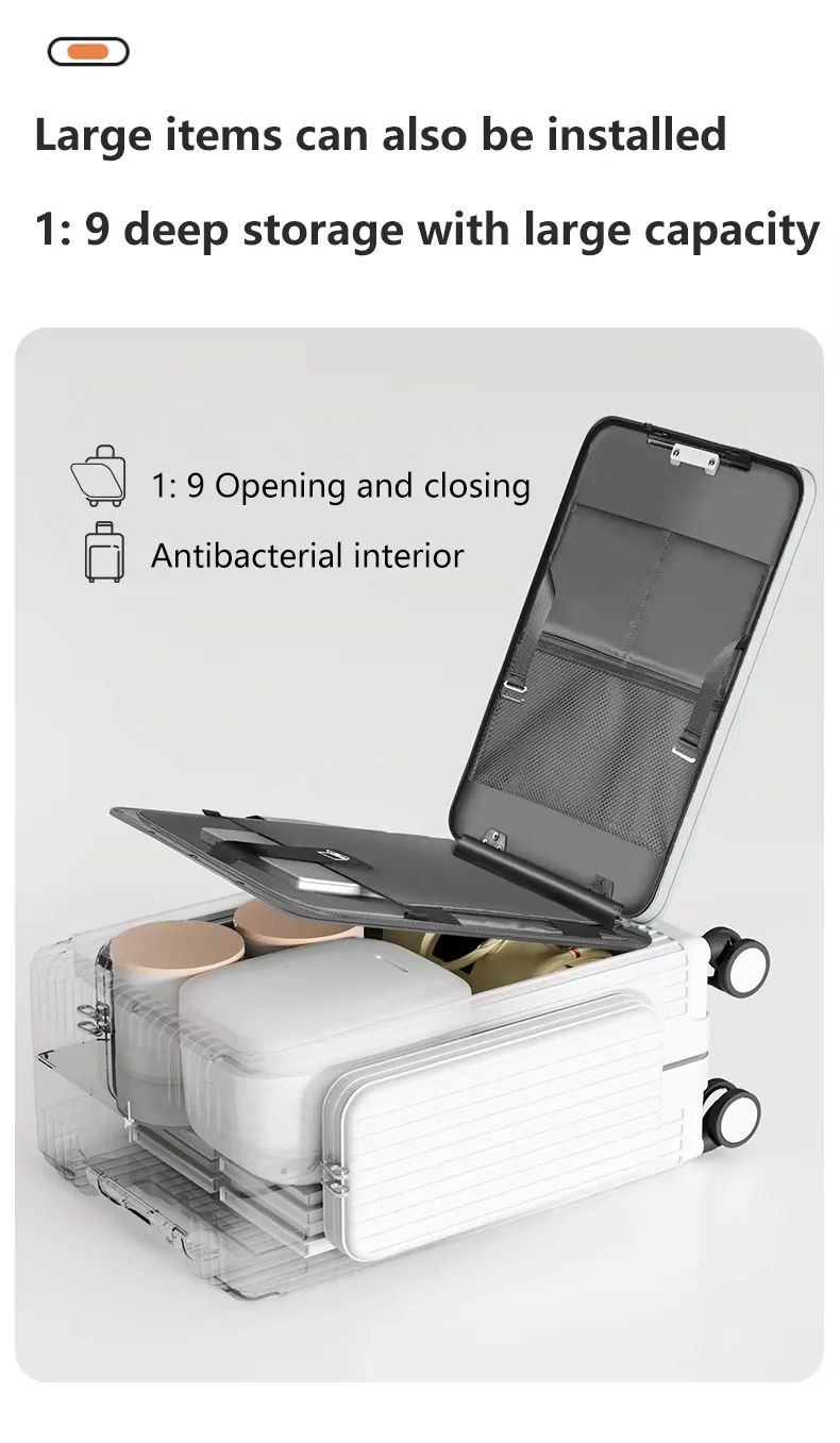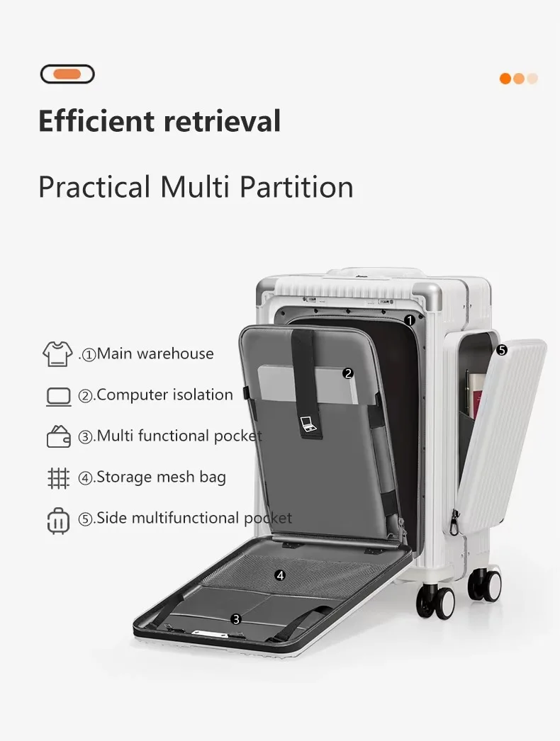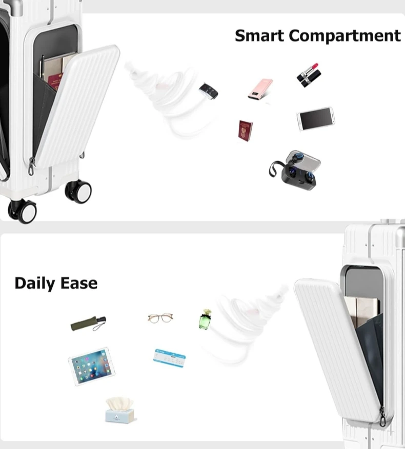 Innovative 3-Zone Access Suitcase: Effortlessly retrieve laptops or passports in seconds via the one-touch button front compartment, Both sides pocket can be divided into smart compartment (for storage earphone,glasses,ipad) and daily ease(for storage keys, lipsticks, passport, umbrella,ect), and backed by a 1:9 deep-expansion main compartment that accommodates tall or bulky belongings vertically, and keeping essentials separate, packing more intelligently.