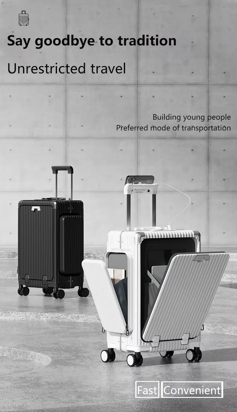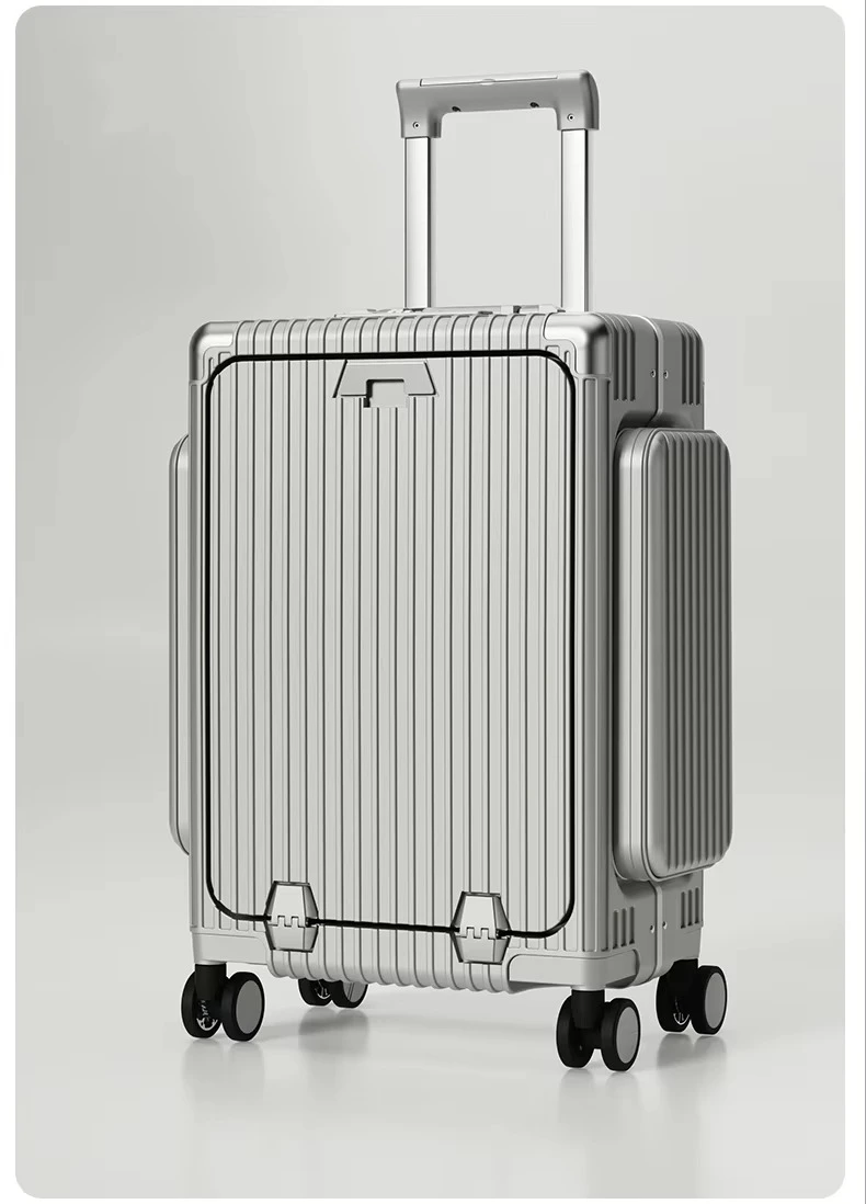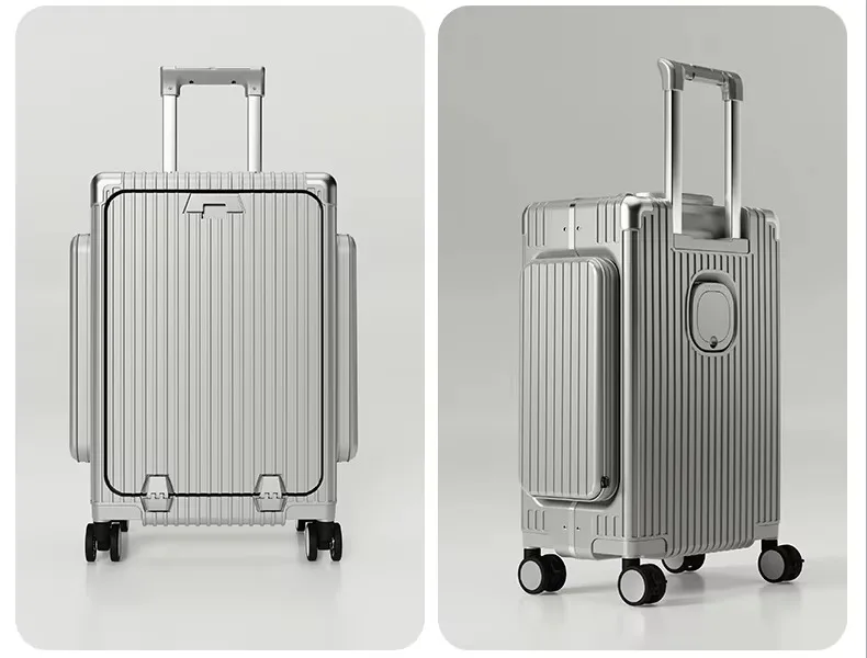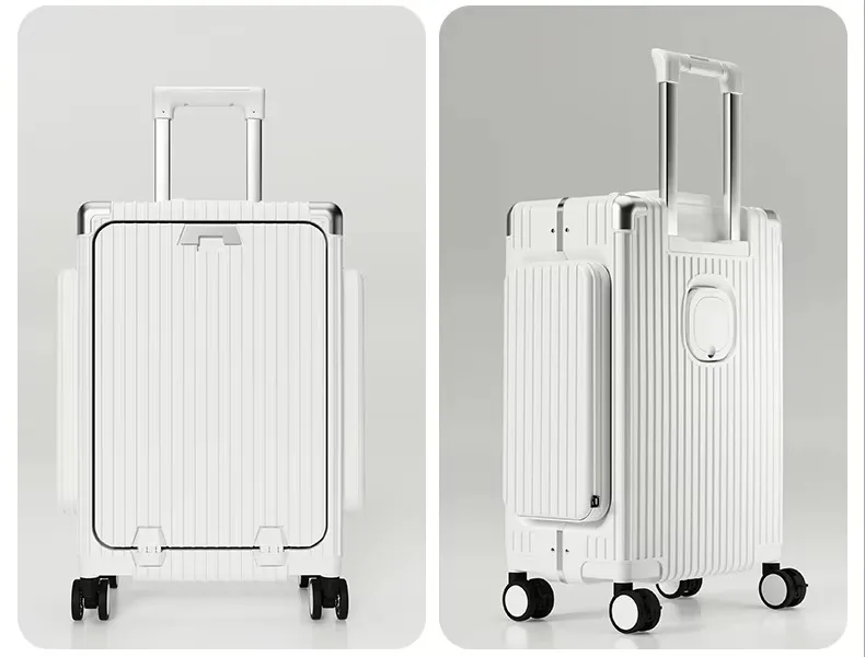 Tri-Zone Access Opening Suitcase Aluminum Frame PC Material Travel Case with Spinner Wheels Cup Holder TSA Lock Rolling Luggage