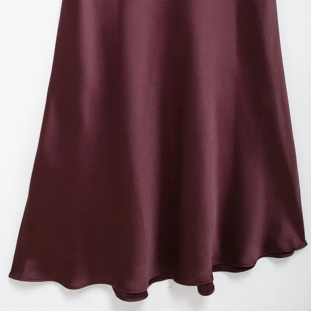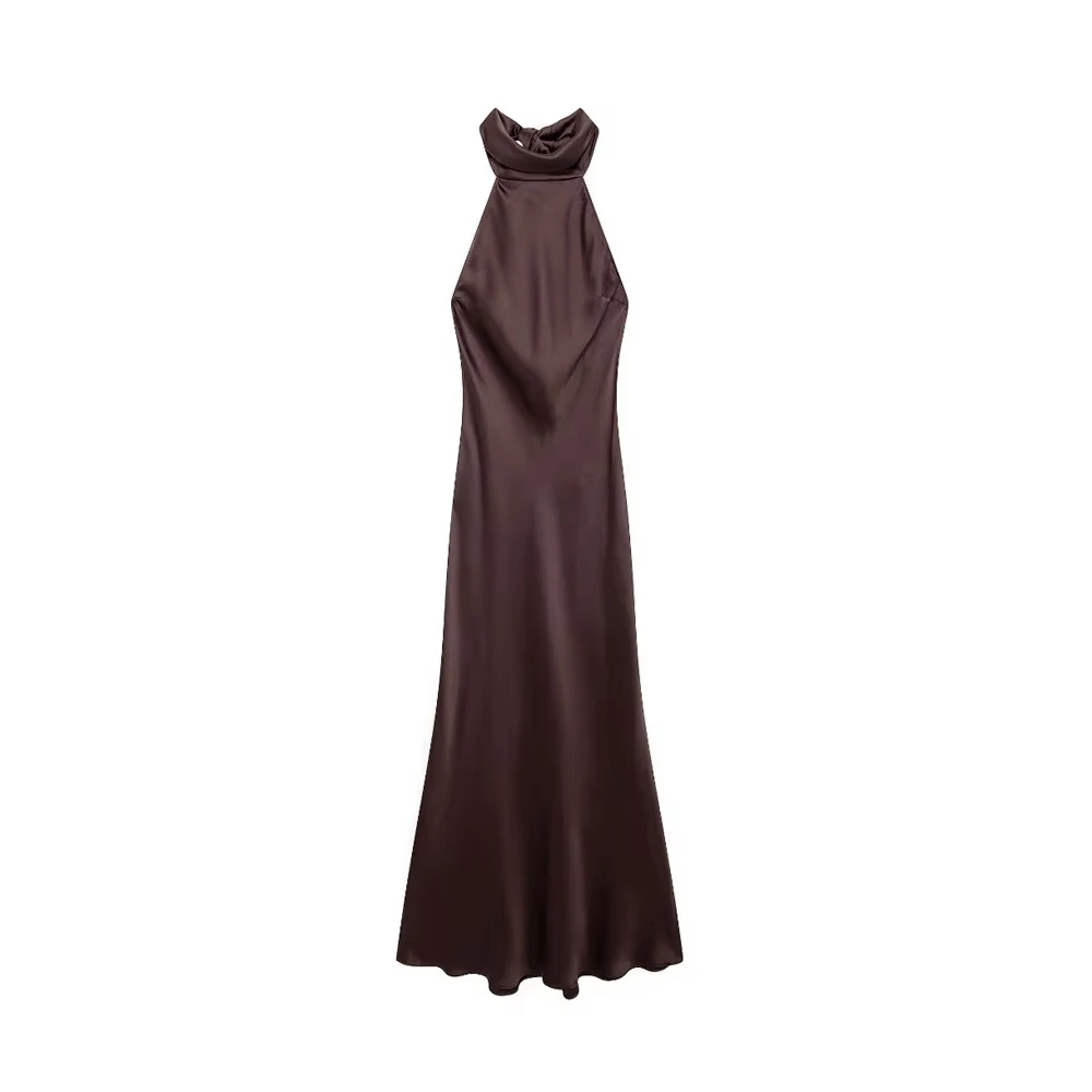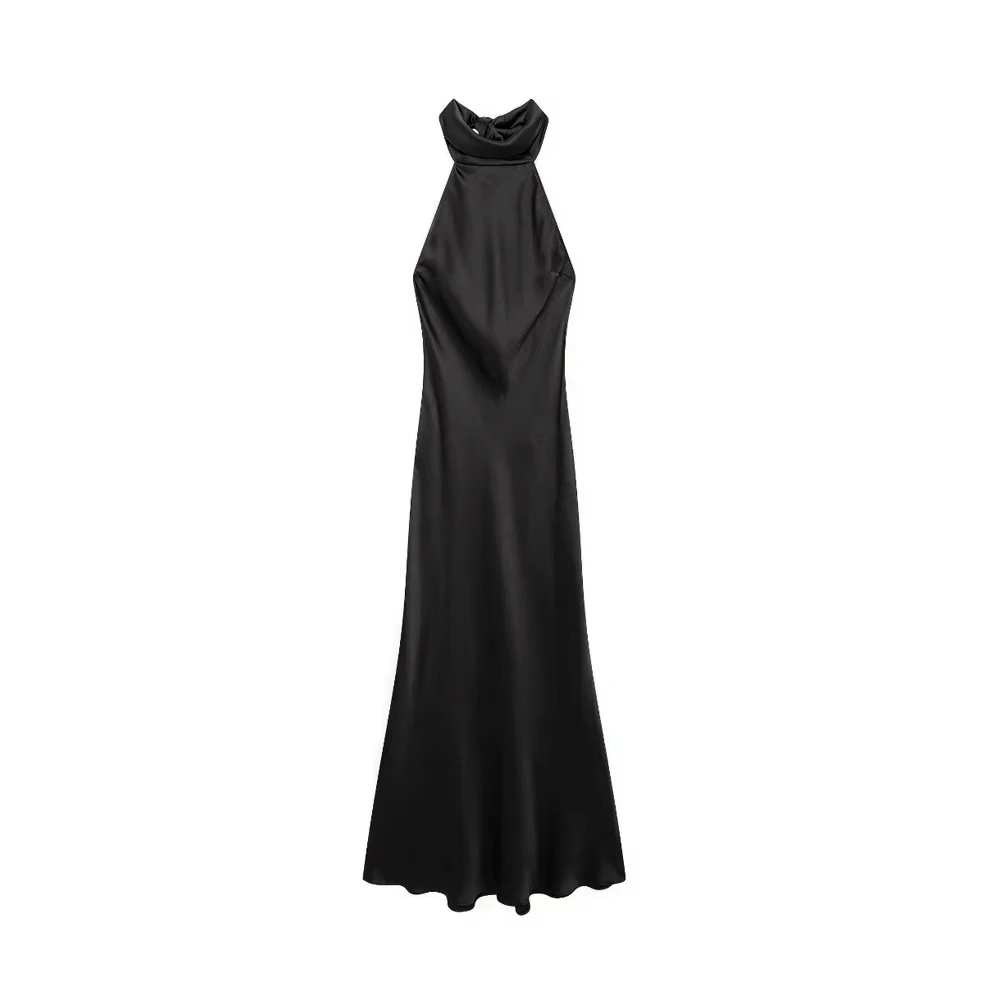 TRZA-Women's Long Satin Halter Dress, Backless, Bow Tied, Back Zipper, Female Dr