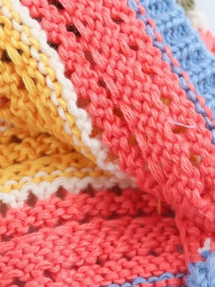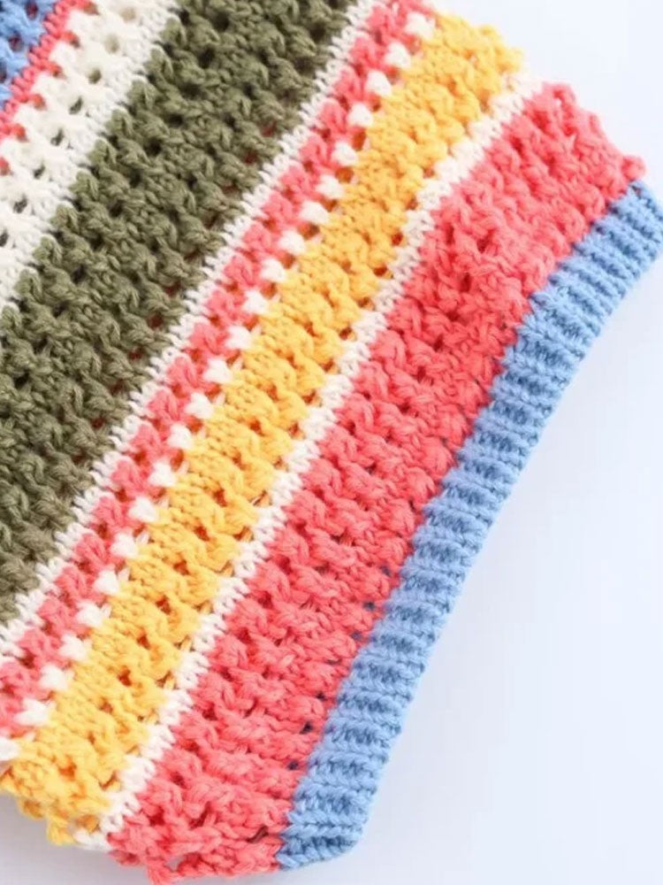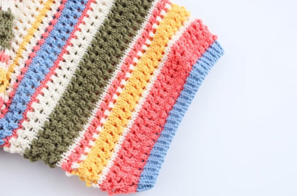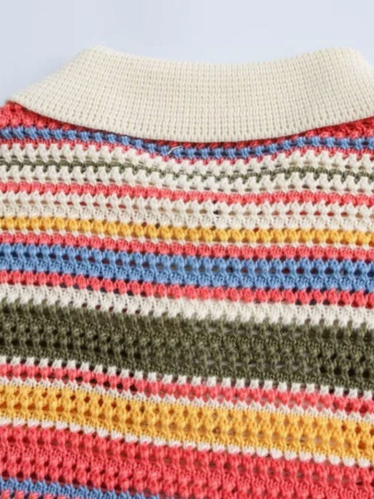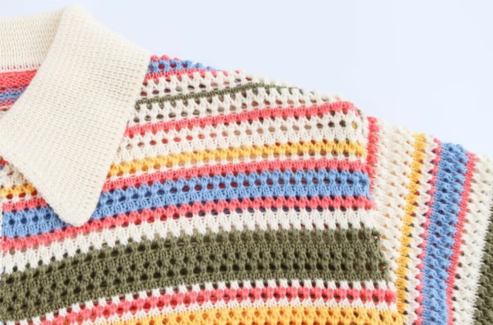 TRZA-Women's Striped Crochet Knit Crop Sweater, Polo Collar, Short Sleeve, Button-up, Female Outerwear, Chic Tops, Fashion