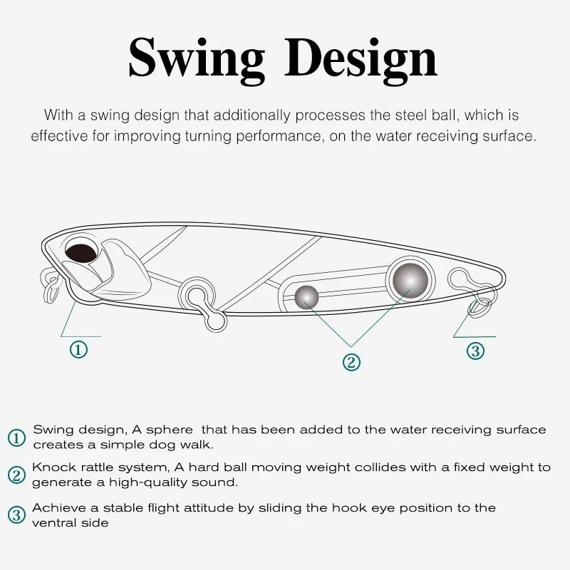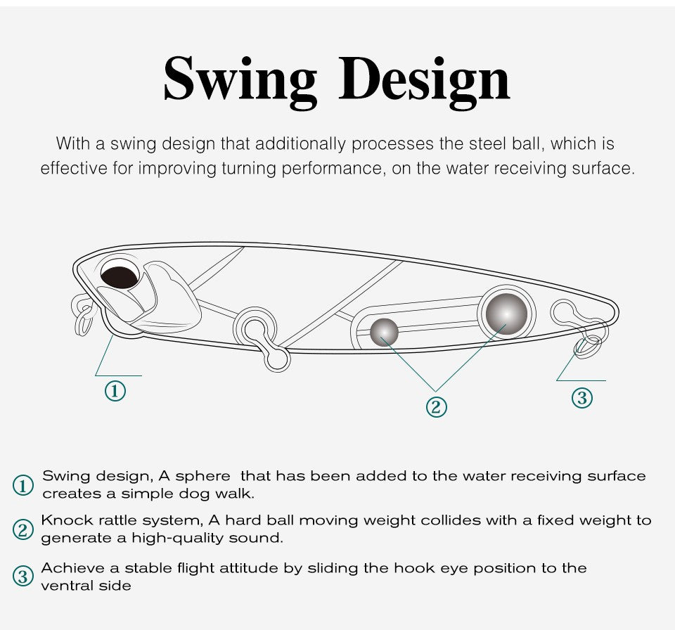 The 110F adopts a thin body, with a swing design that additionally processes the steel ball, which is effective for improving turning performance, on the water receiving surface. Anyone can easily produce a beautiful dog walk action.