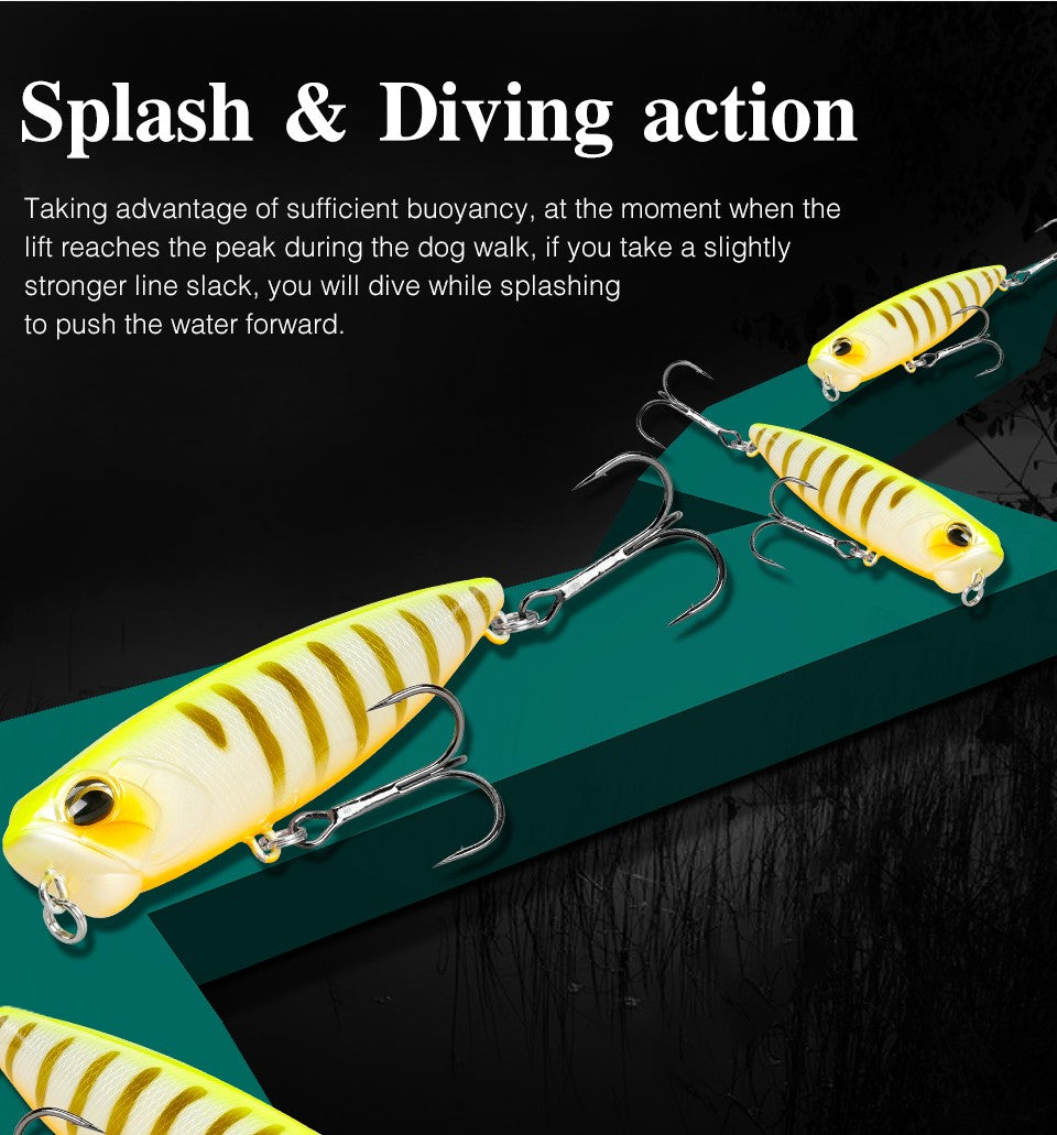 2. Splash & diving action: Taking advantage of sufficient buoyancy, at the moment when the lift reaches the peak during the dog walk, if you take a slightly stronger line slack, you will dive while splashing to push the water forward