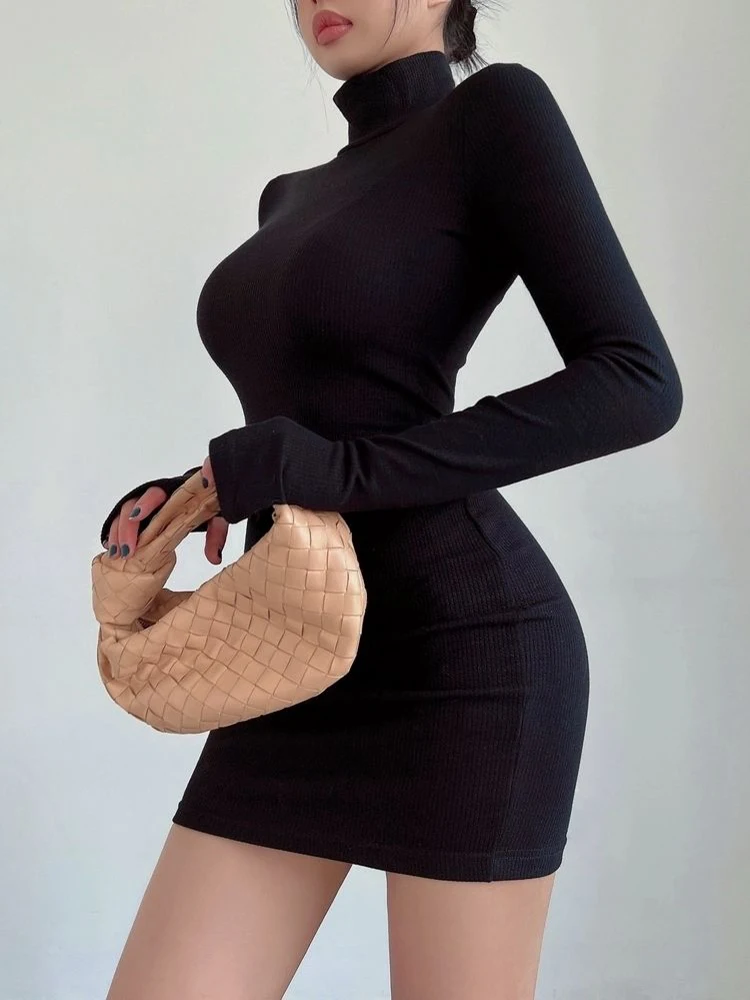 Turtleneck Long Sleeves Dresses Black Sexy Pleated Bodycon Mini Dress 2025 Fall Winter Women Streetwear Party Club Y2K Clothings
