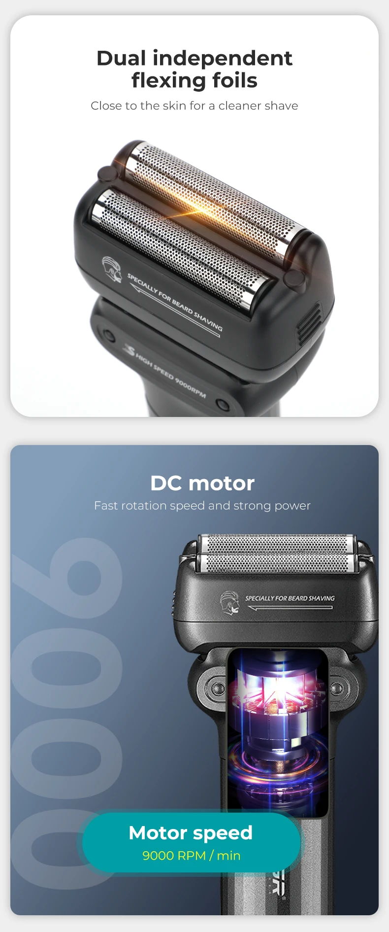? Precision Shaving with Dual Flexible Foils:Two independently adjustable foils contour to facial curves, ensuring close contact for maximum shaving efficiency. Engineered for smooth gliding and minimal irritation, it’s ideal for all skin types.