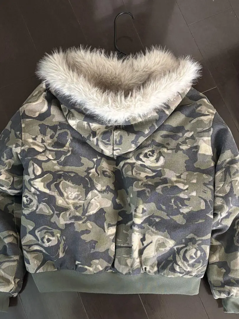 Vintage Camouflage Leaf Plush Warm Coats Zipper Hoodie Cotton Jacket Camouflage Leaf Pattern Oversized Hoodie Sweatshirt Clothes