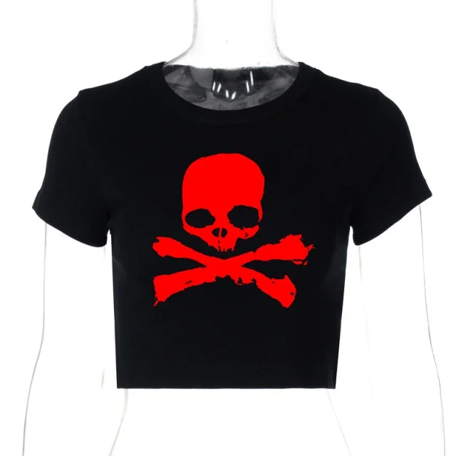 Vintage Grunge Graphic Print Short Sleeve T-Shirt Y2k Slim Crop Top Gothic Skull Punk Streetwear Women's Tee Summer Casual 90s