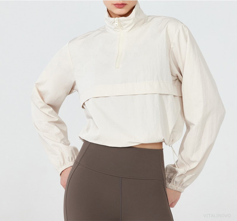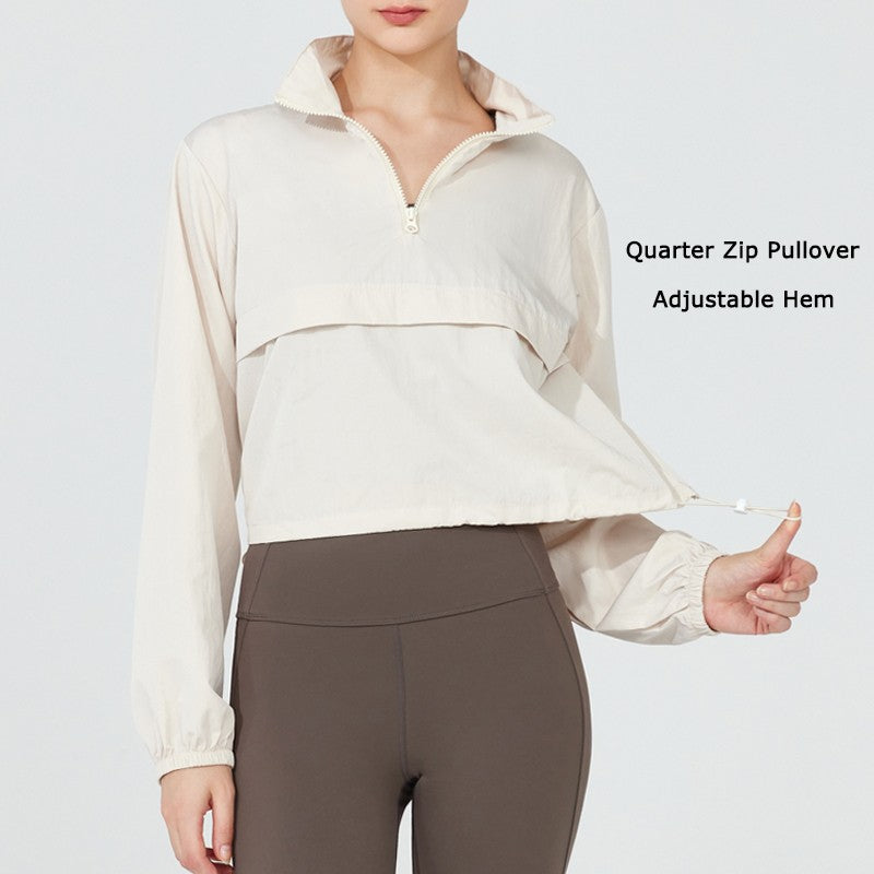 Crop Full-Season Jacket: This quarter zip workout jacket features a cropped length, raglan sleeves, and elastic cuffs. The hem can be tightened using the adjustable drawcords. It is great for fall, spring, and summer wear.