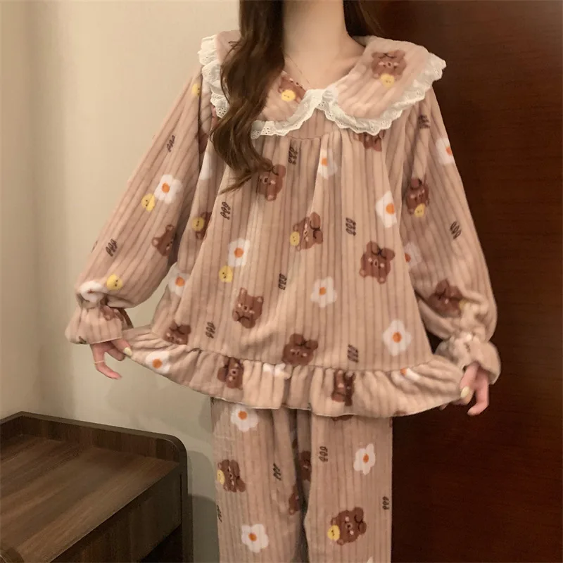 Warm Sleepwear Small Bear Peach Coral Velvet Two-Piece Set Women Pajamas Autumn and Winter Thickening Home Wear School Sleepwear