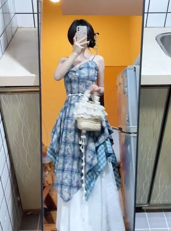 Watercolor Gingham Slip Dress Women 2025 Summer Sweetheart Aesthetic Asymmetric Tie Waist A Line Dreamcore Romance
