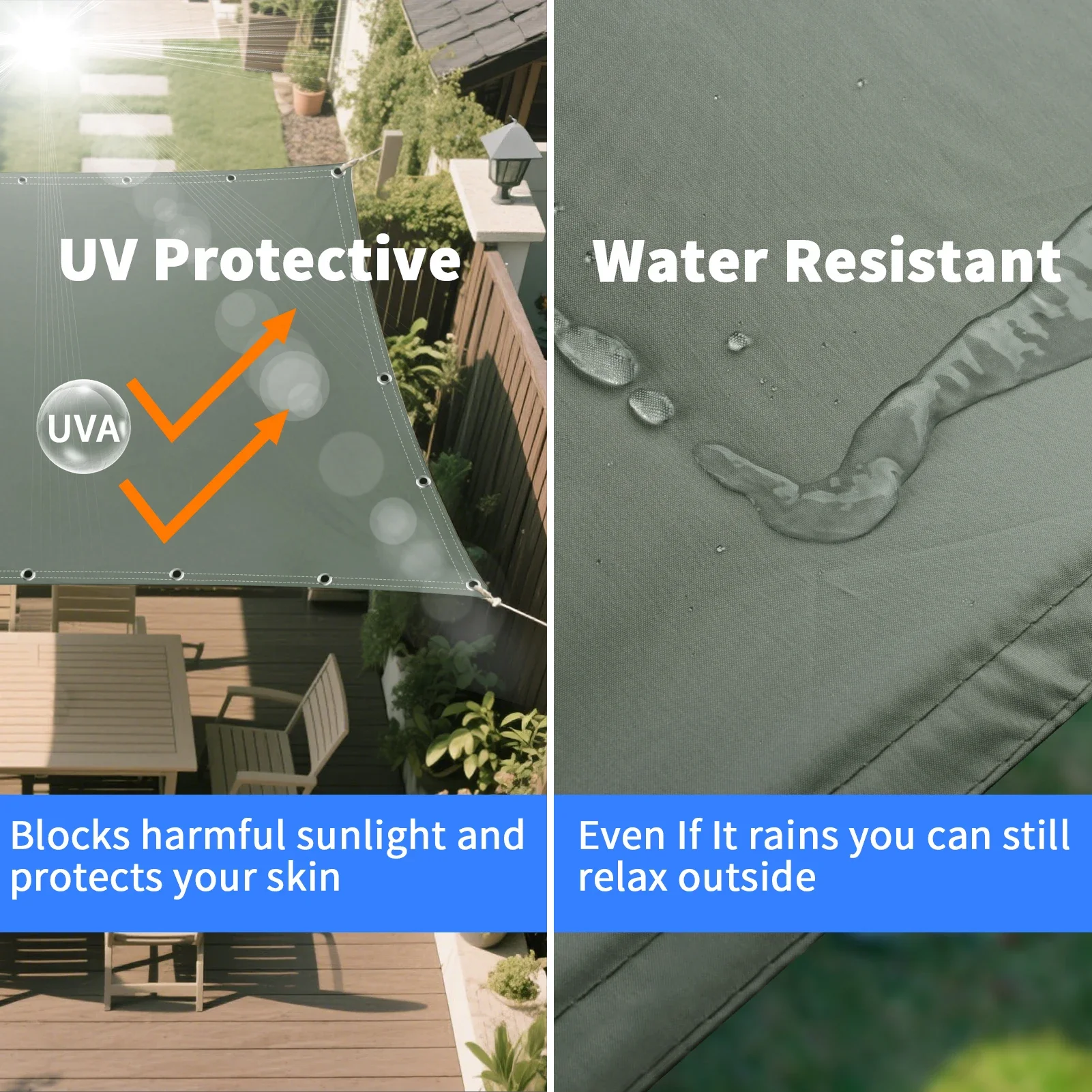 Waterproof: The surface of this shade sail will look like lotus leaves when it hits water. The water condenses into droplets and rolls on the fabric surface instead of penetrating through the fabric. Suggest an installation angle of 20-40 degrees to achieve maximum tension and also allow rain to drain away.